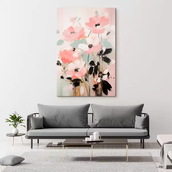 Pictură pe pânză Flori roz și negre cu frunze, culori pastelate delicate, aranjament floral abstract, artă minimalistă Nr s46688