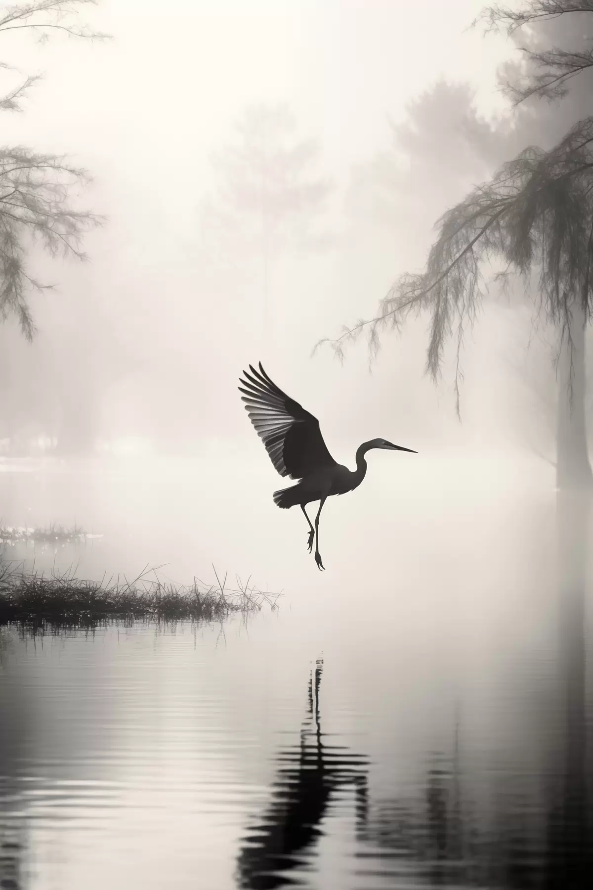 Tablouri O stârcă albă cu aripile întinse, zburând lângă stufărișuri înalte, compoziție minimalistă în alb și negru s46694