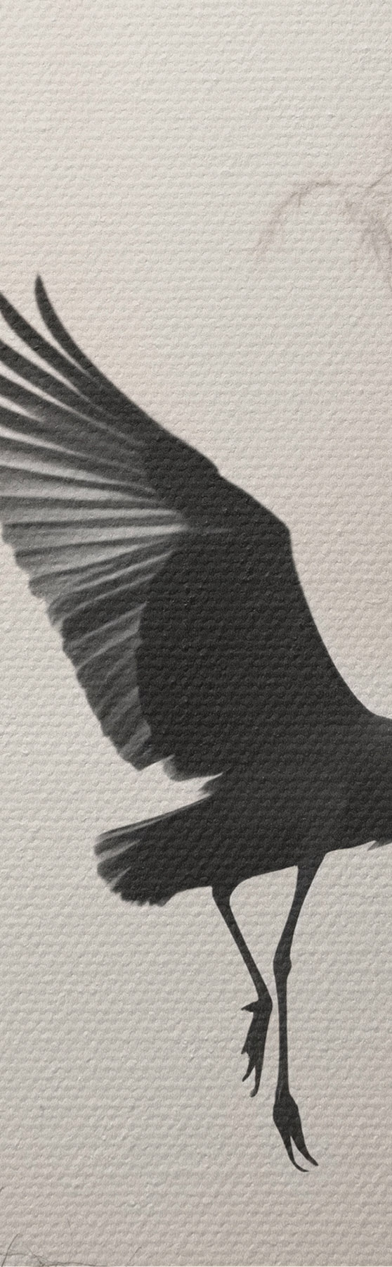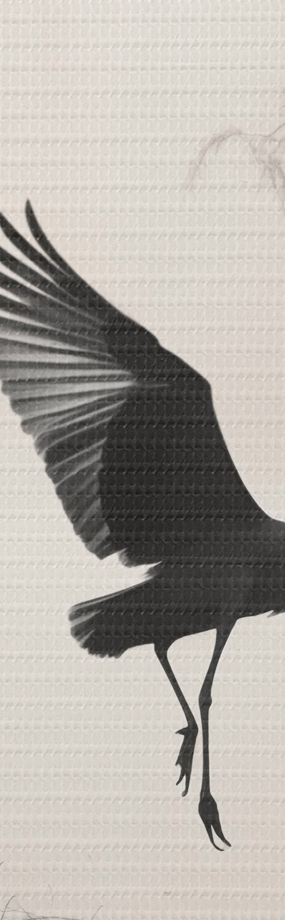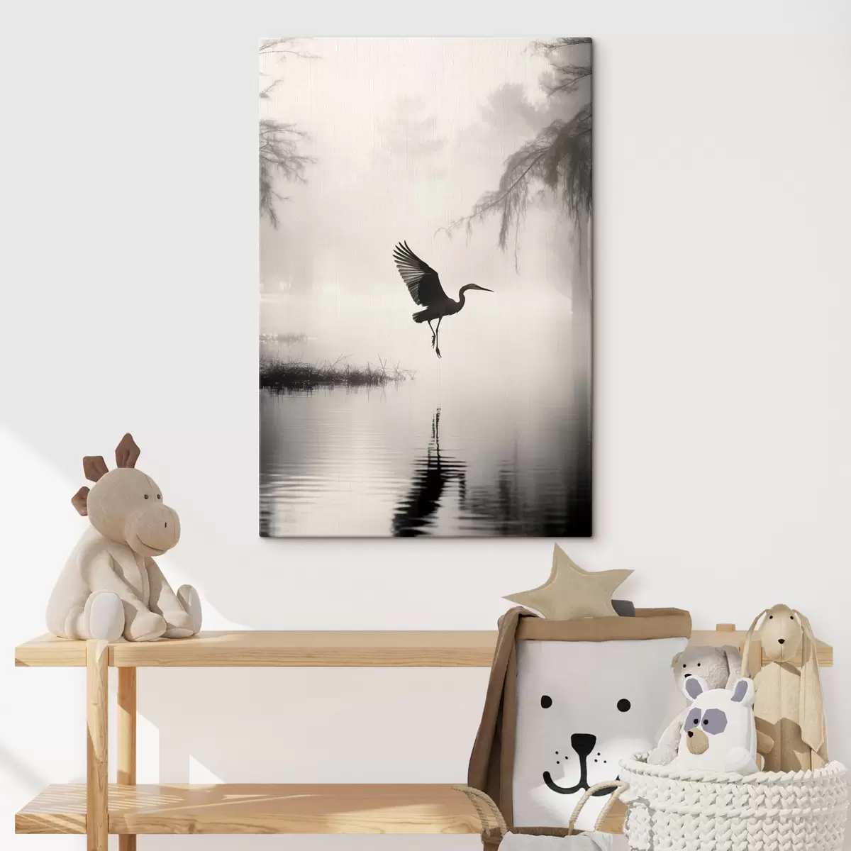 Pictură pe pânză O stârcă albă cu aripile întinse, zburând lângă stufărișuri înalte, compoziție minimalistă în alb și negru Nr s46694