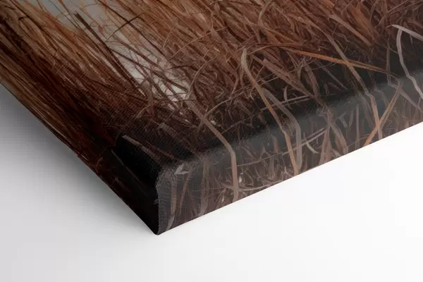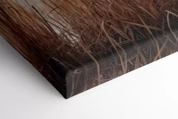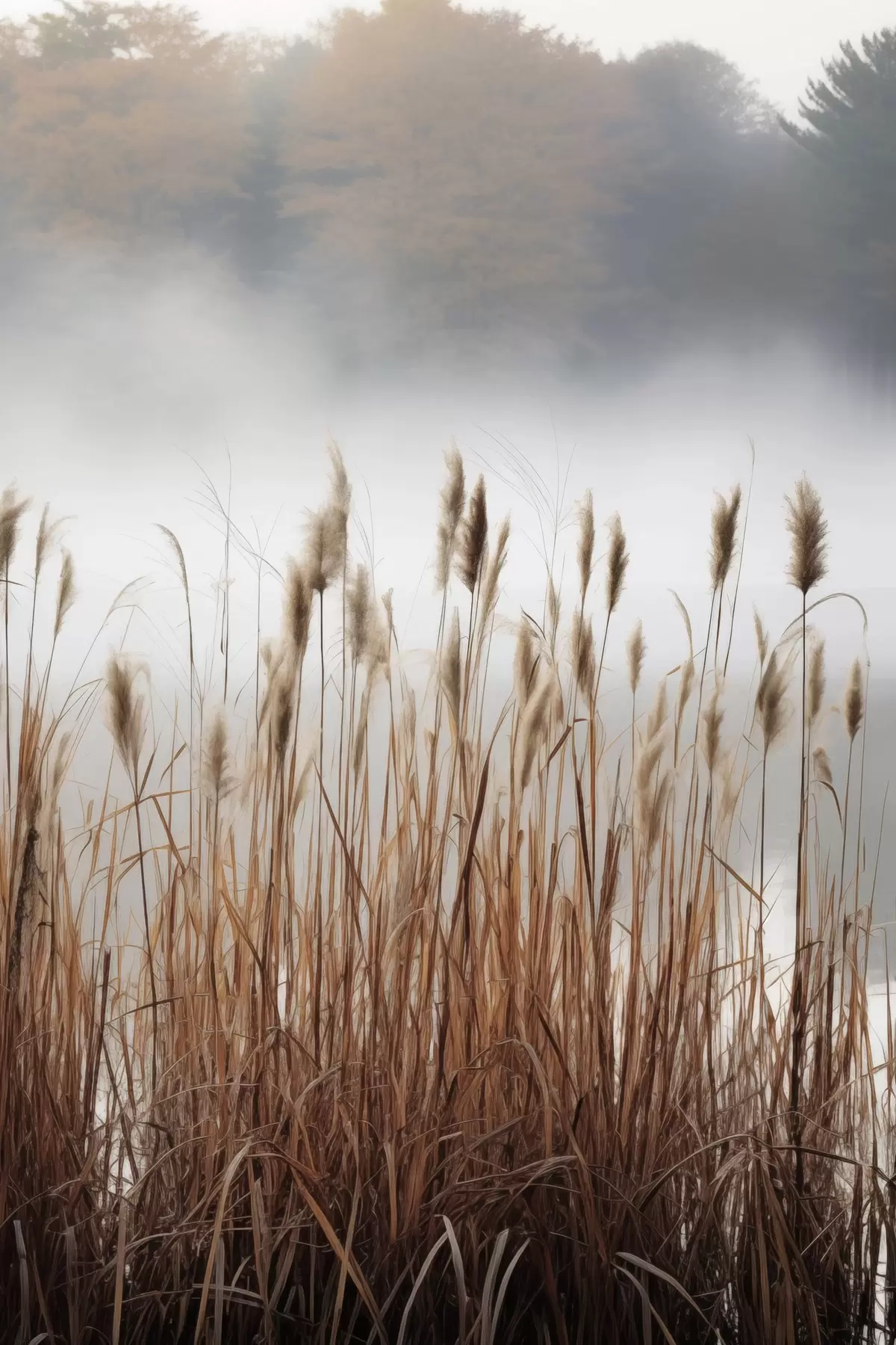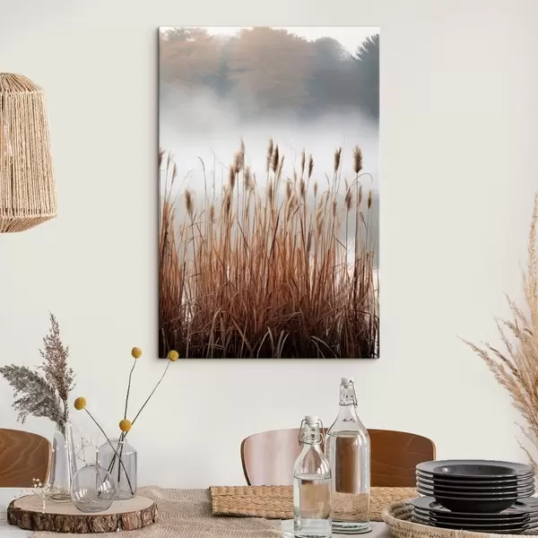 Pictură pe pânză Stuf înalt crescând într-un corp de apă, apa reflectă stuful, fundal cețos, lumină difuză, peisaj natural Nr s46696