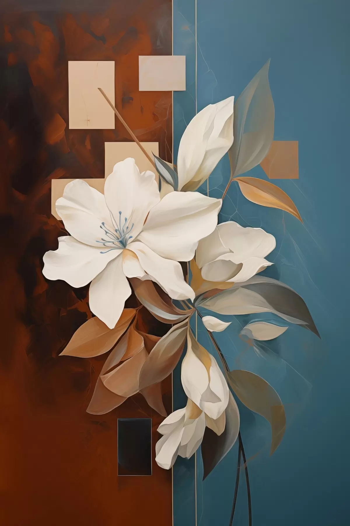 Tablouri Flori și frunze albe abstracte pe un fundal maro și albastru cu forme abstracte, într-un stil minimalist s46709