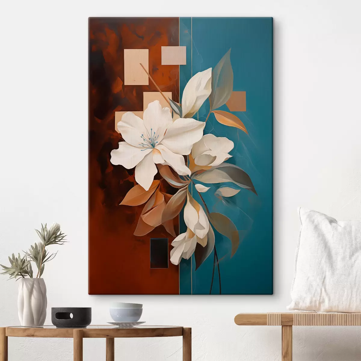 Pictură pe pânză Flori și frunze albe abstracte pe un fundal maro și albastru cu forme abstracte, într-un stil minimalist Nr s46709