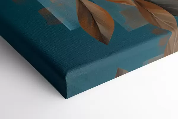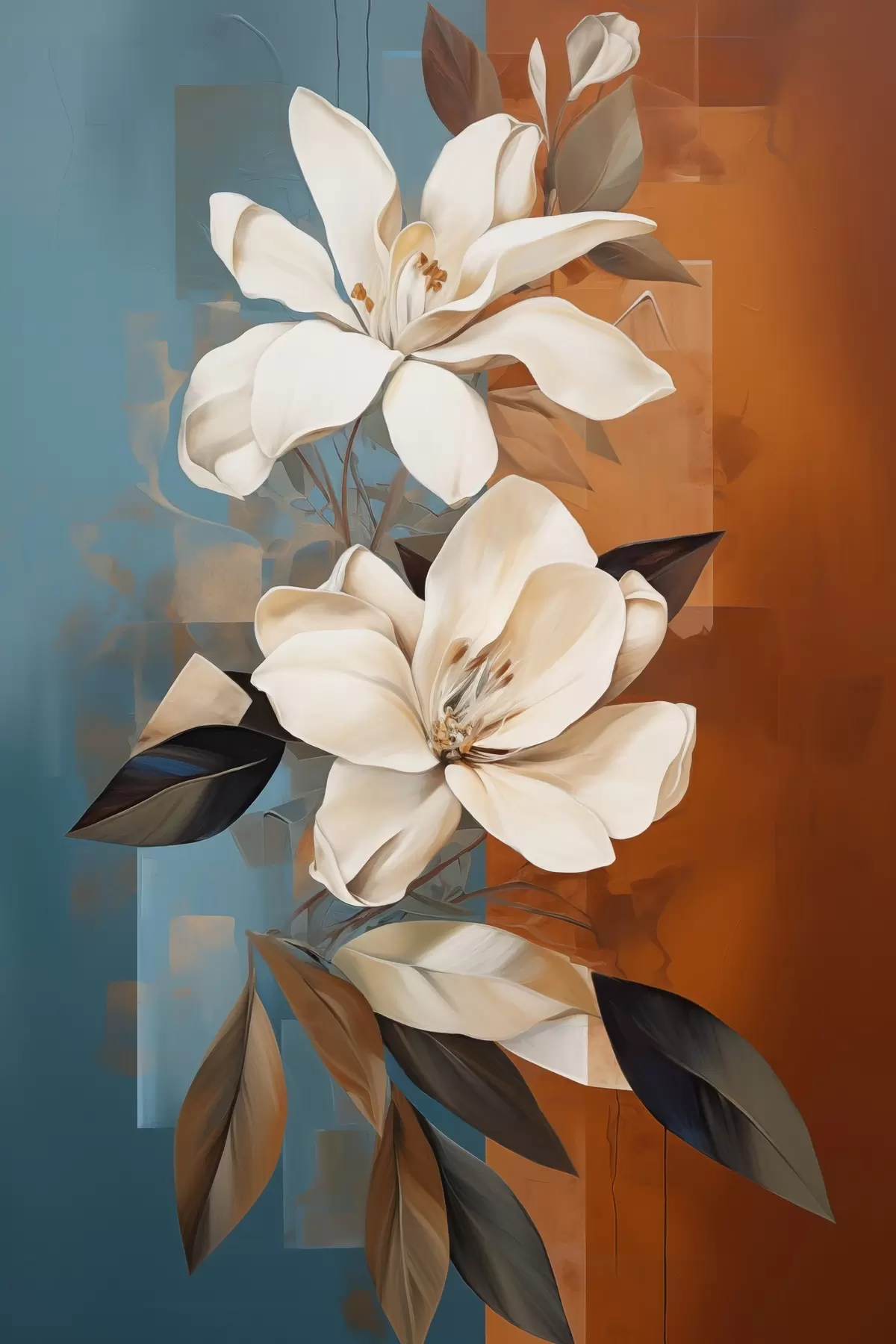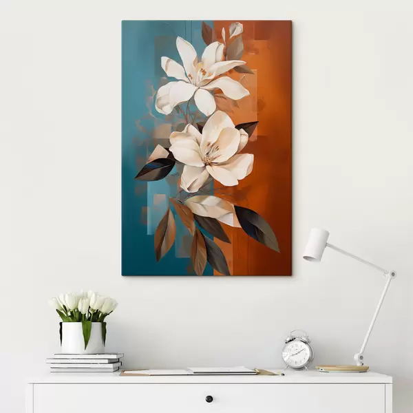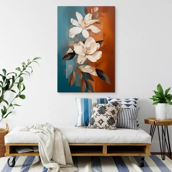 Pictură pe pânză Flori și frunze albe abstracte pe un fundal maro și albastru cu forme abstracte, într-un stil minimalist Nr s46710