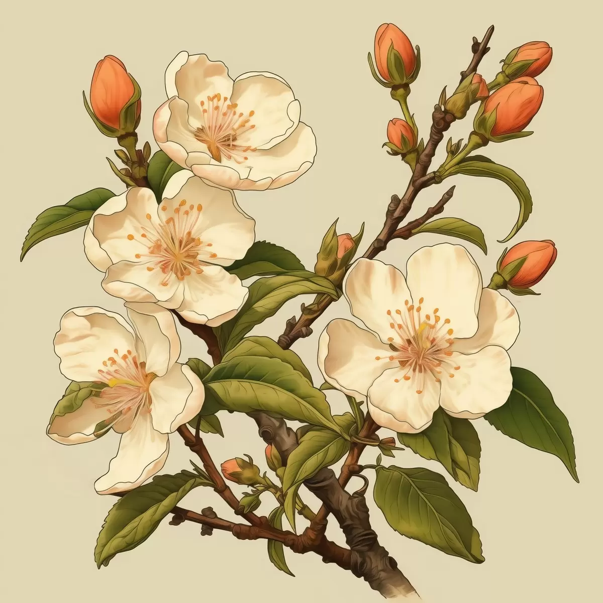 Tablouri Ramură înflorită cu flori albe pe fundal bej, în stilul ilustrației clasice s46923