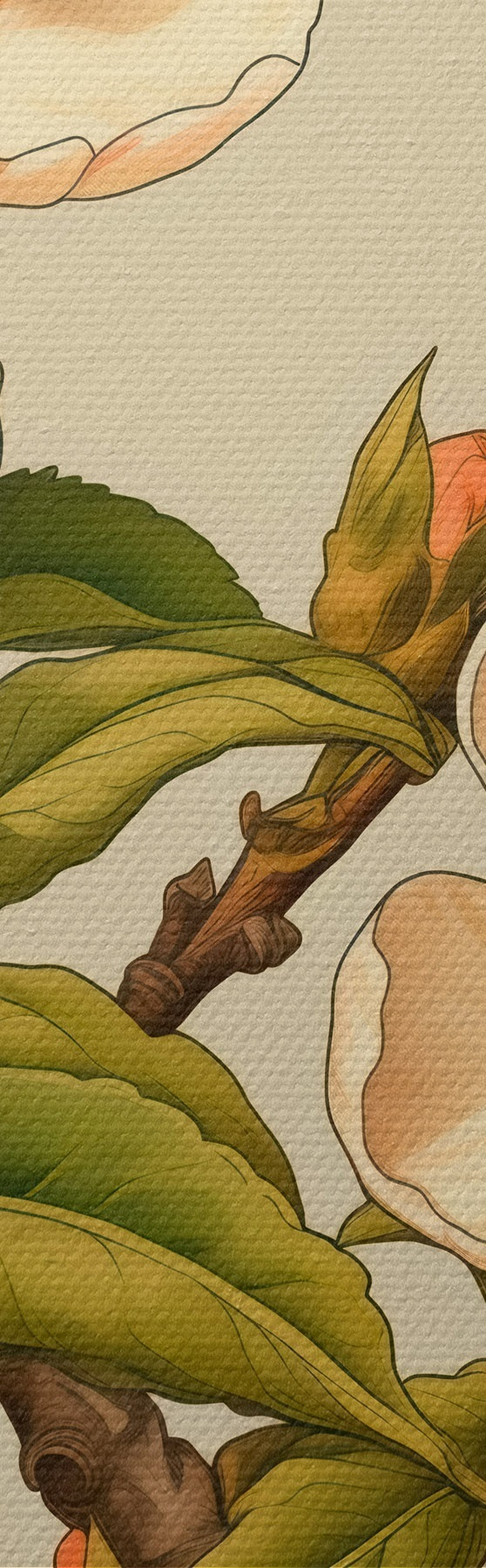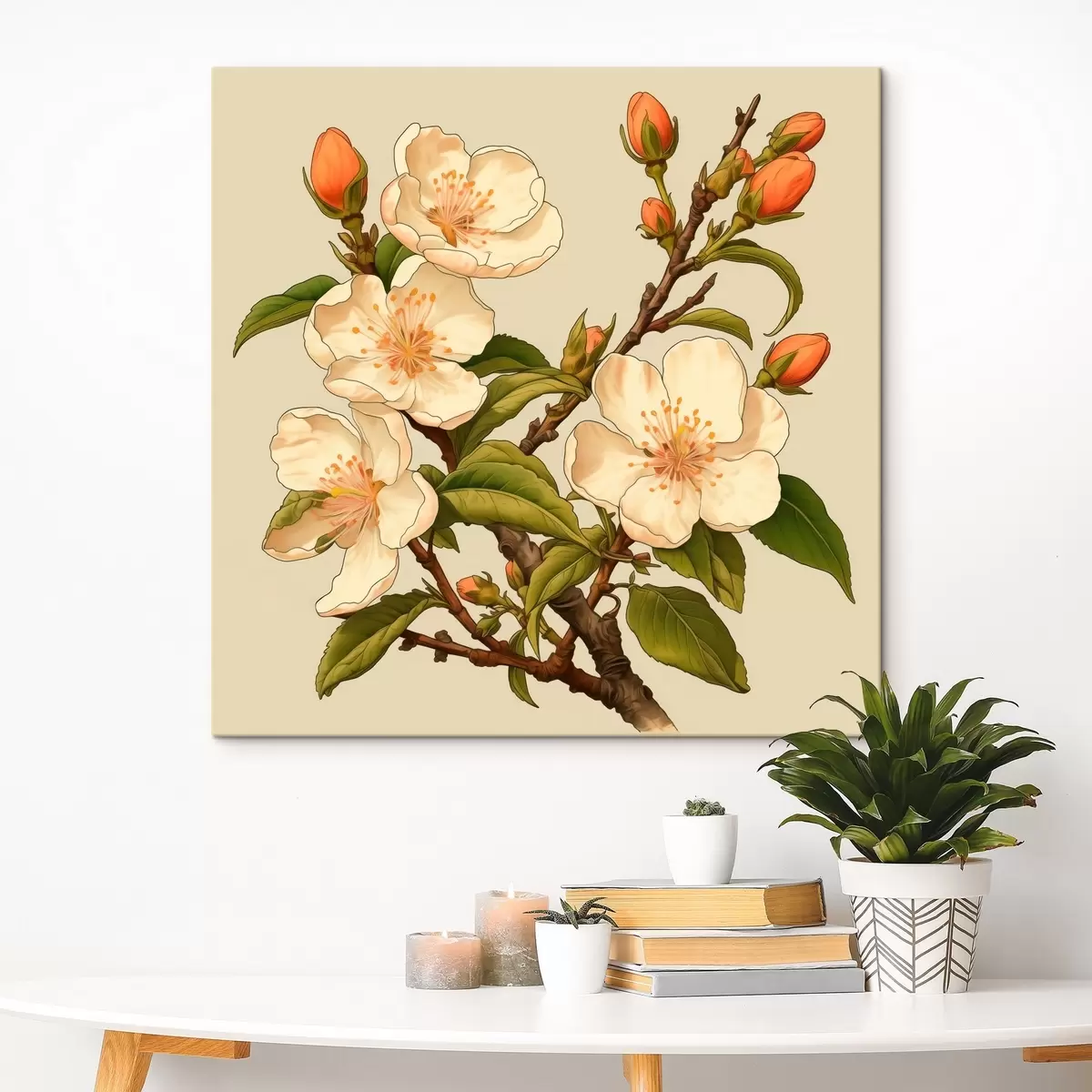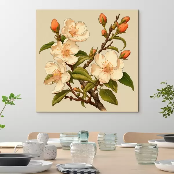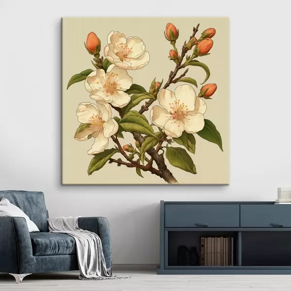 Pictură pe pânză Ramură înflorită cu flori albe pe fundal bej, în stilul ilustrației clasice Nr s46923