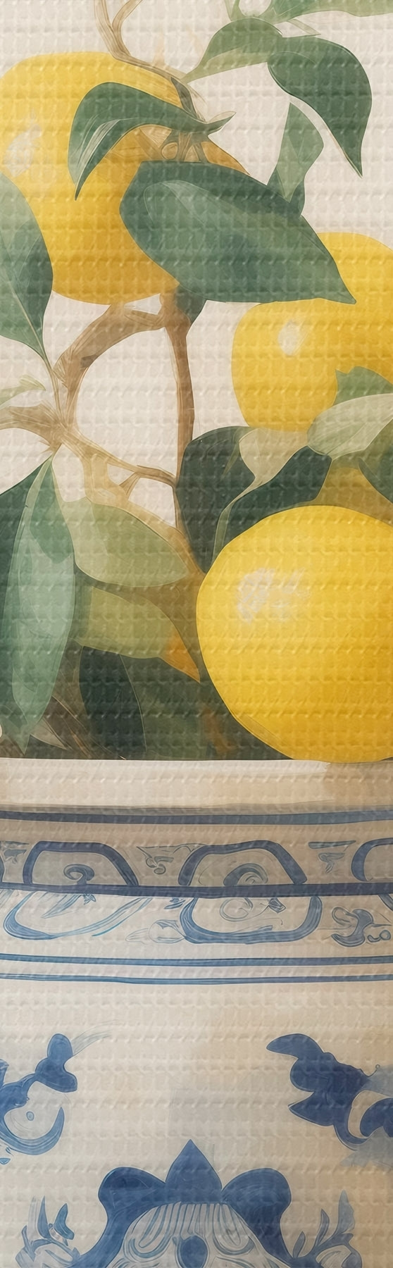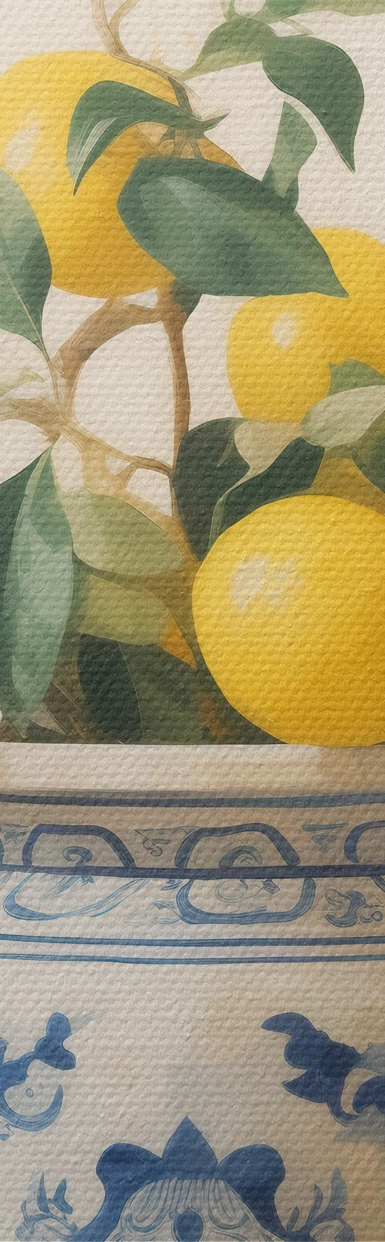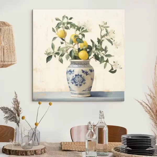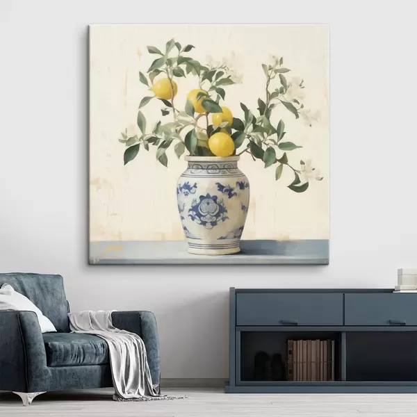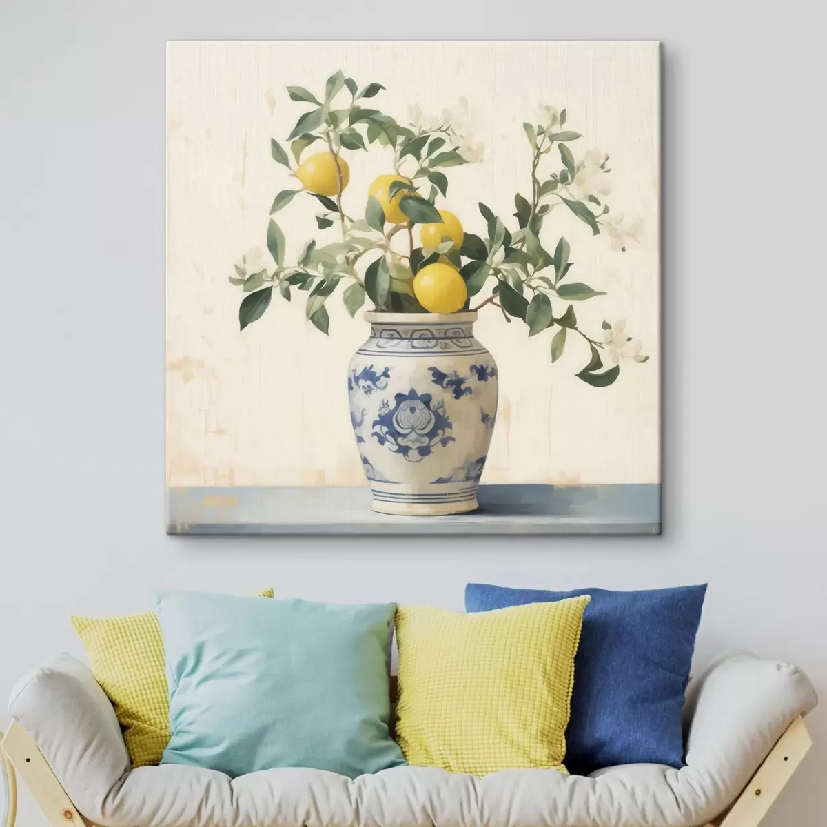 Tablouri Lămâi într-un vas ceramic albastru și alb, în stilul picturii în ulei s46924