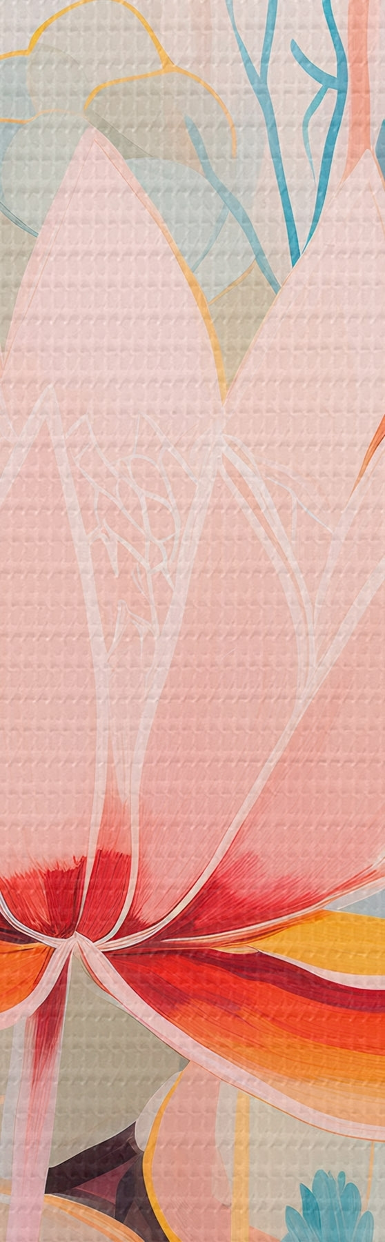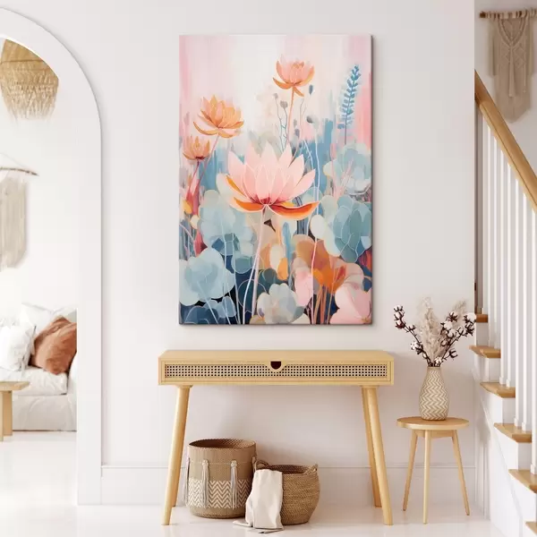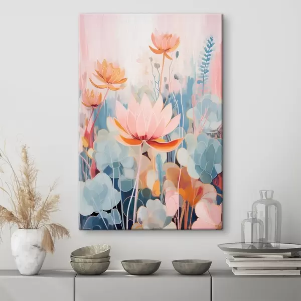 Pictură pe pânză Lotusuri și frunziș decorativ într-o paletă de culori roz și albastru Nr s46929
