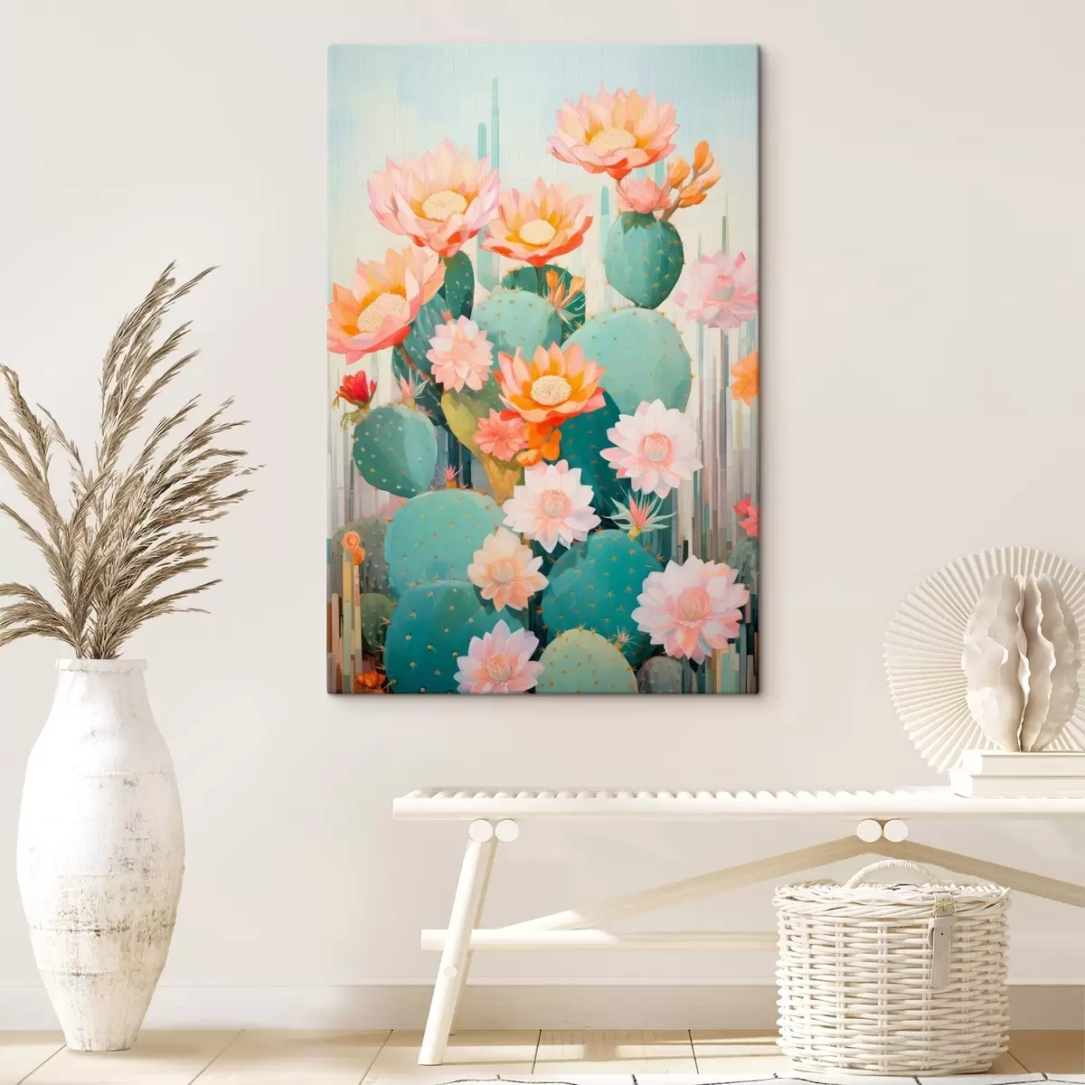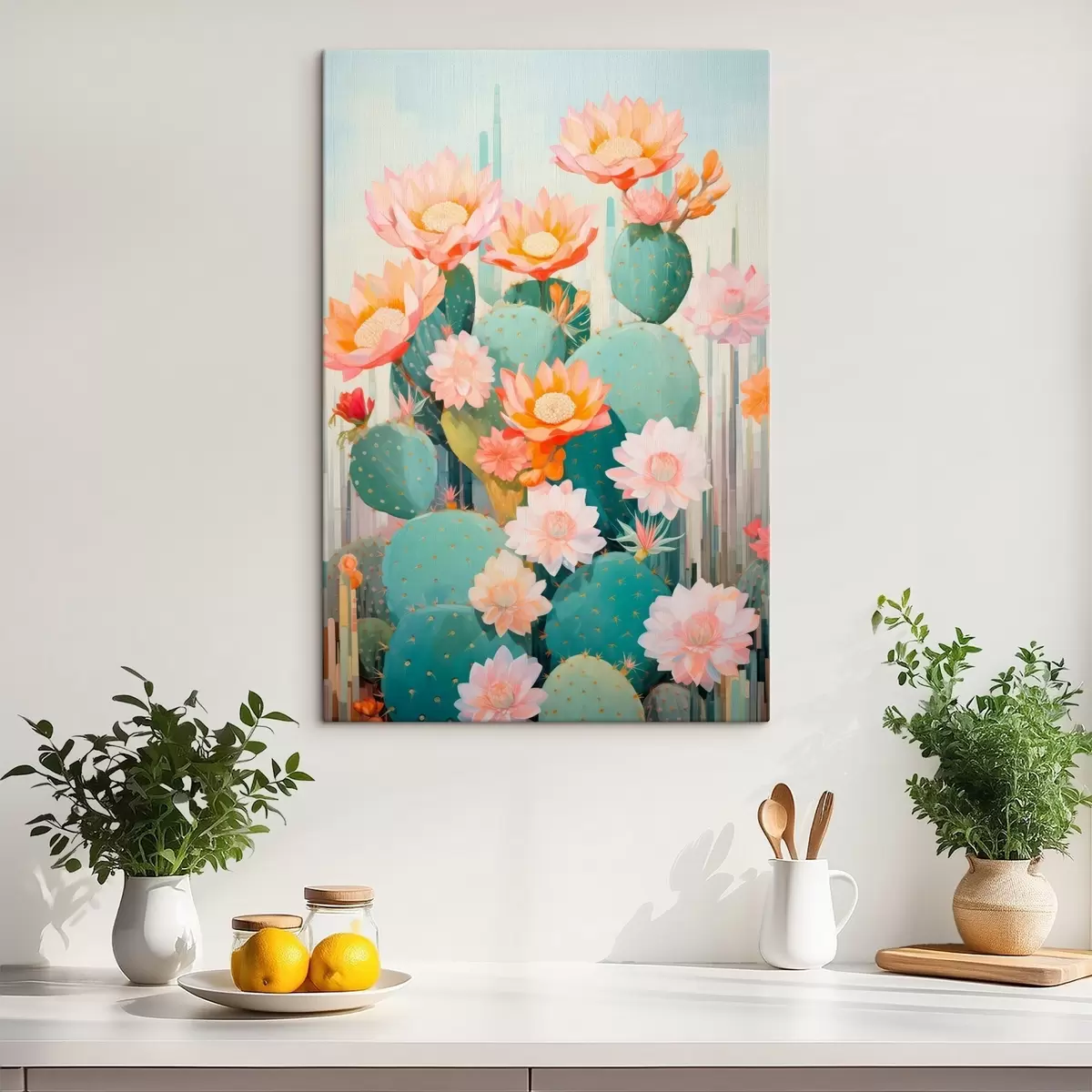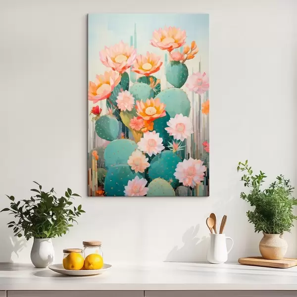 Pictură pe pânză Grădină cu flori de cactus într-o paletă pastelată delicată, în stil ilustrativ Nr s46935