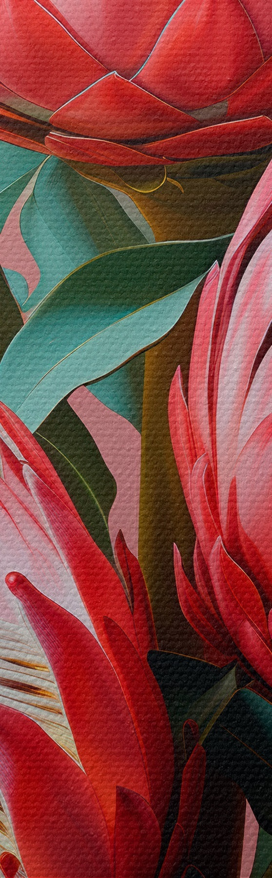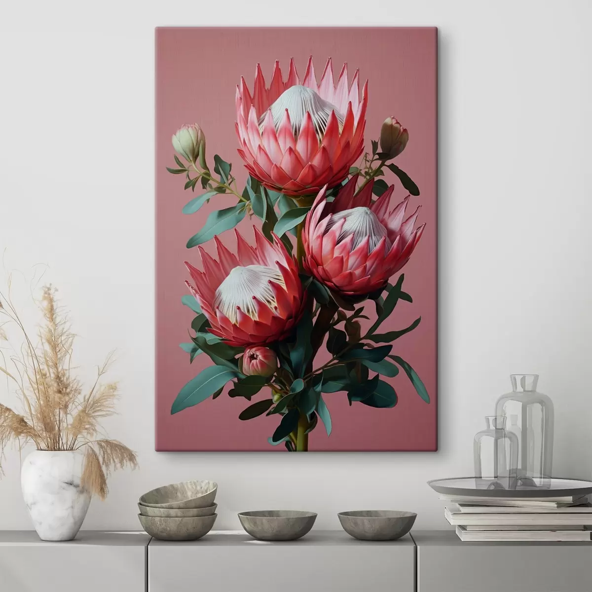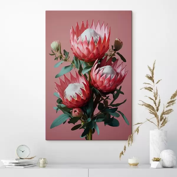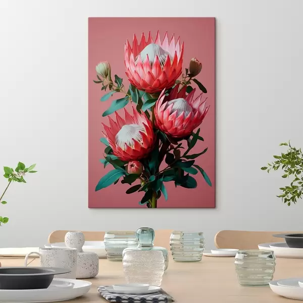 Pictură pe pânză Buchet de protea cu petale roșii și frunze verzi pe un fundal roz Nr s46946