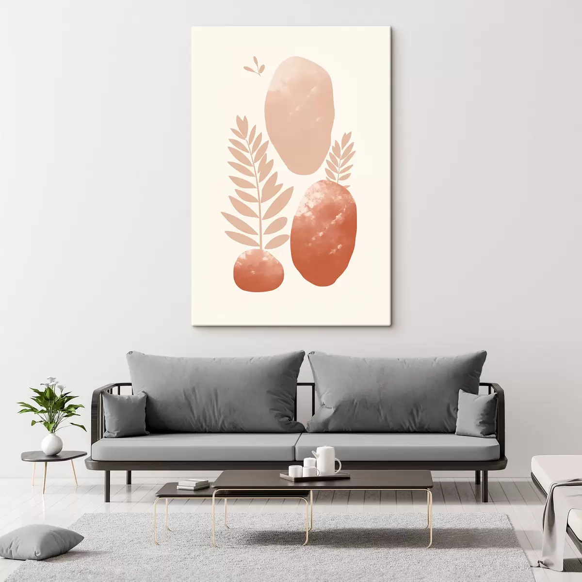 Pictură pe pânză Forme abstracte, pietre texturate și frunze în nuanțe discrete de piersică și teracotă, fundal minimalist, crem Nr s47012