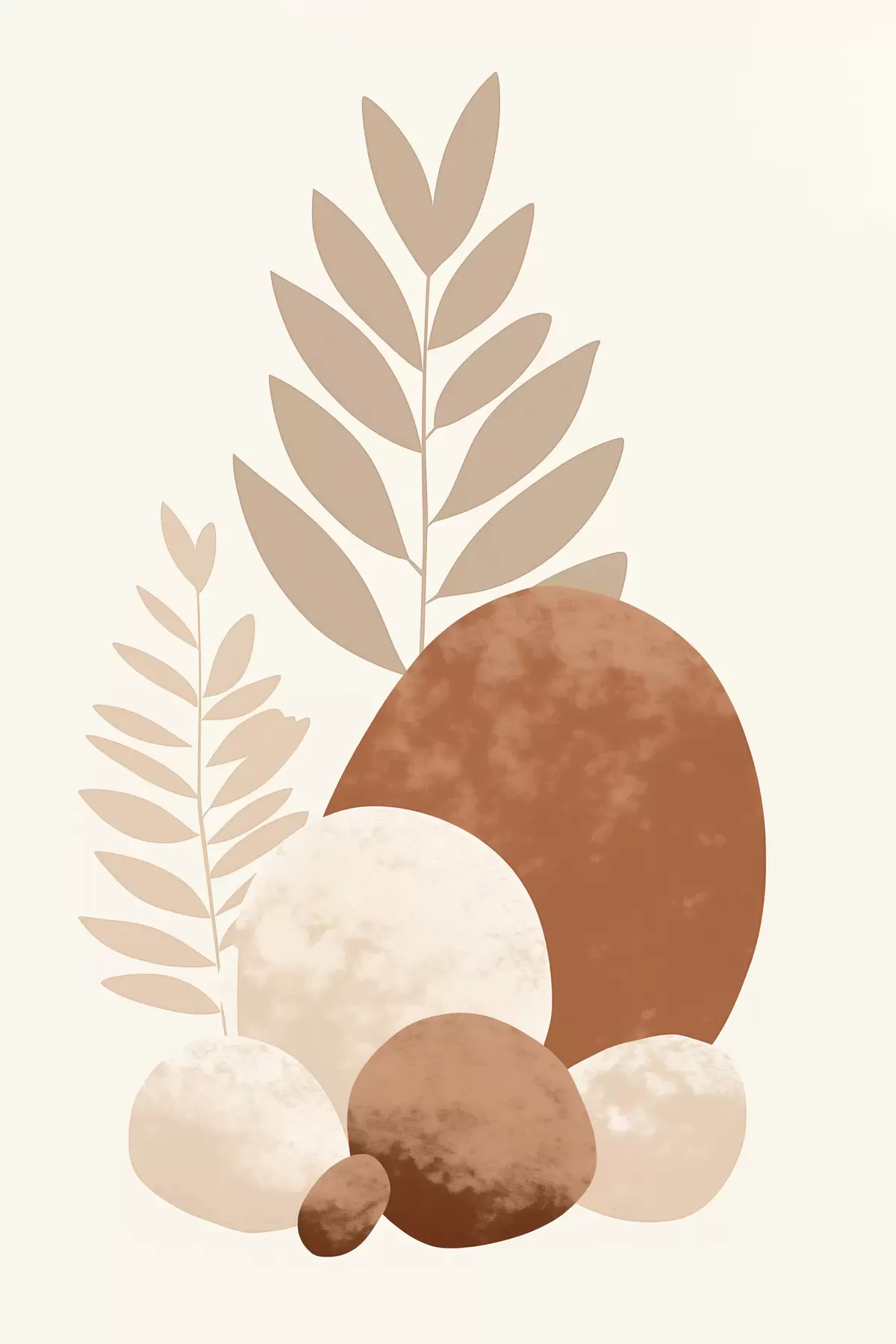 Tablouri Forme abstracte, pietre texturate și frunze în nuanțe discrete de piersică și teracotă, fundal minimalist, crem s47013