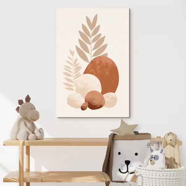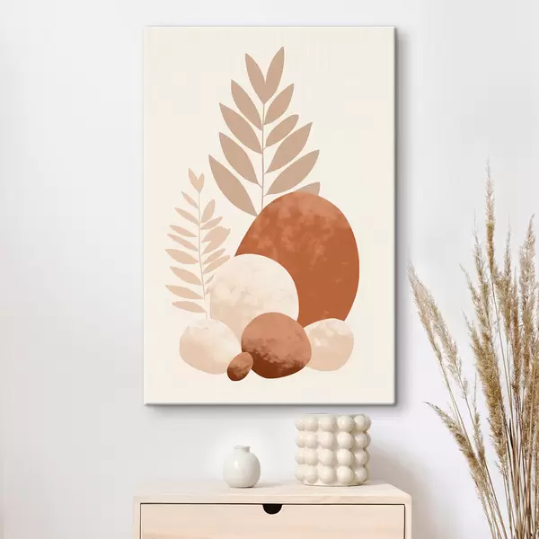Pictură pe pânză Forme abstracte, pietre texturate și frunze în nuanțe discrete de piersică și teracotă, fundal minimalist, crem Nr s47013