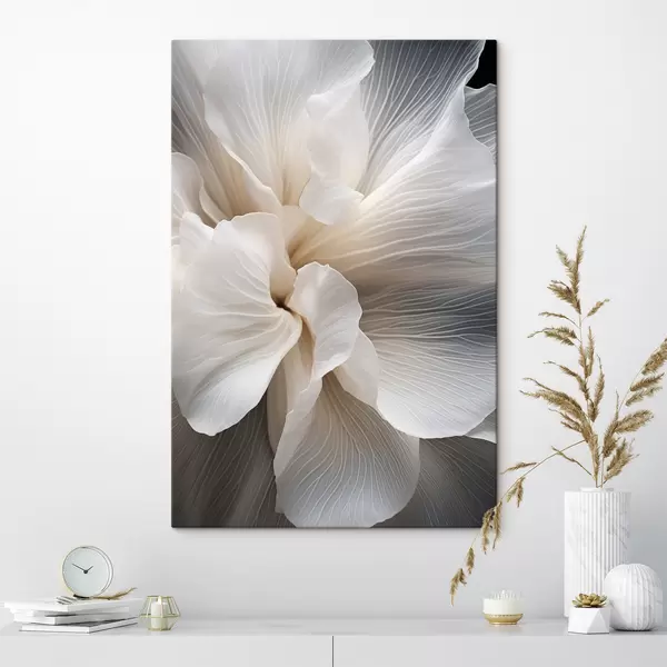 Pictură pe pânză Prim-plan cu petale florale albe abstracte delicate, cu linii complexe și un fundal întunecat estompat Nr s47018