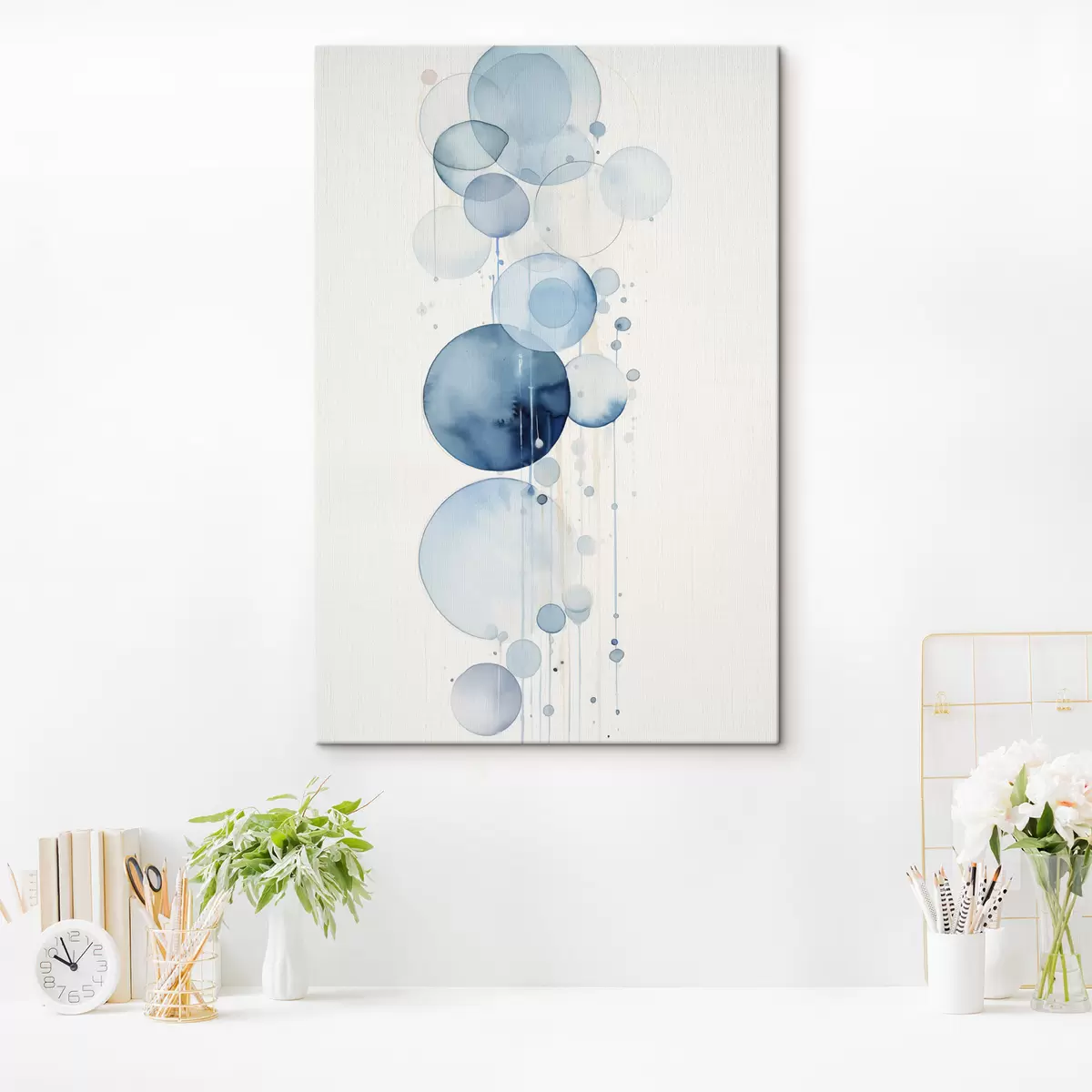 Pictură pe pânză Cercuri abstracte texturate albastre și albe, de diferite dimensiuni, pe fond alb Nr s47021