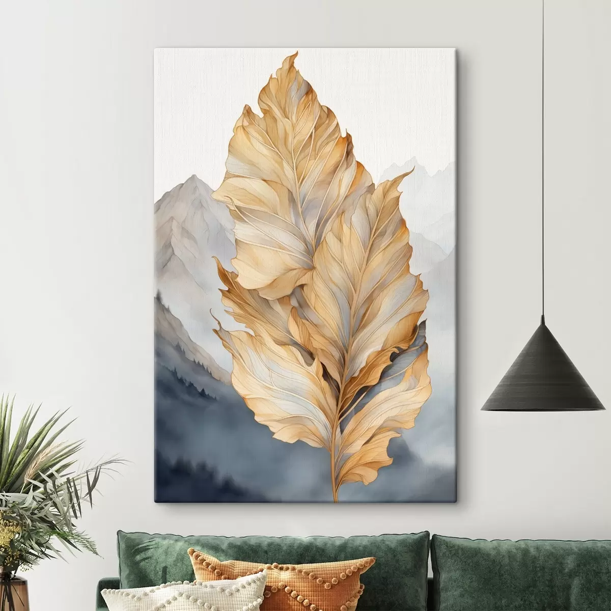 Pictură pe pânză Frunze abstracte mari, galbene și maronii, cu detalii complexe, pe fundalul unui peisaj montan Nr s47022