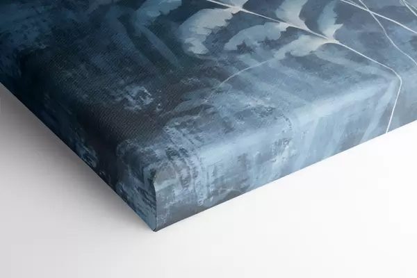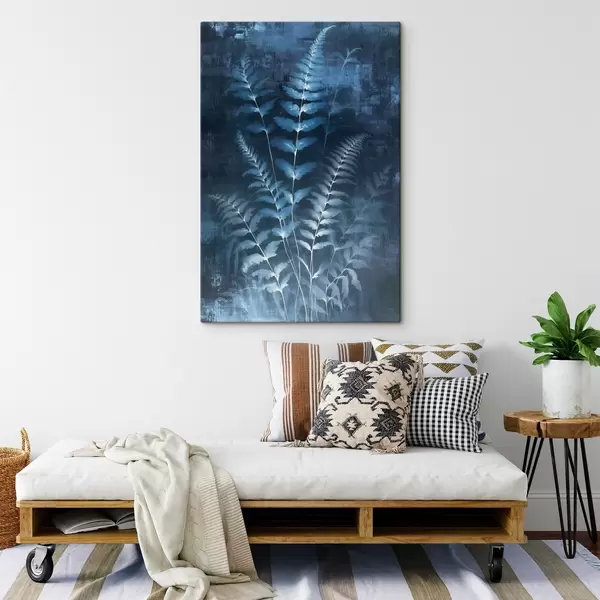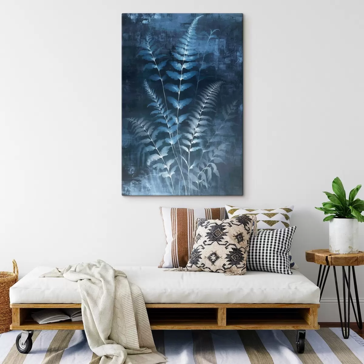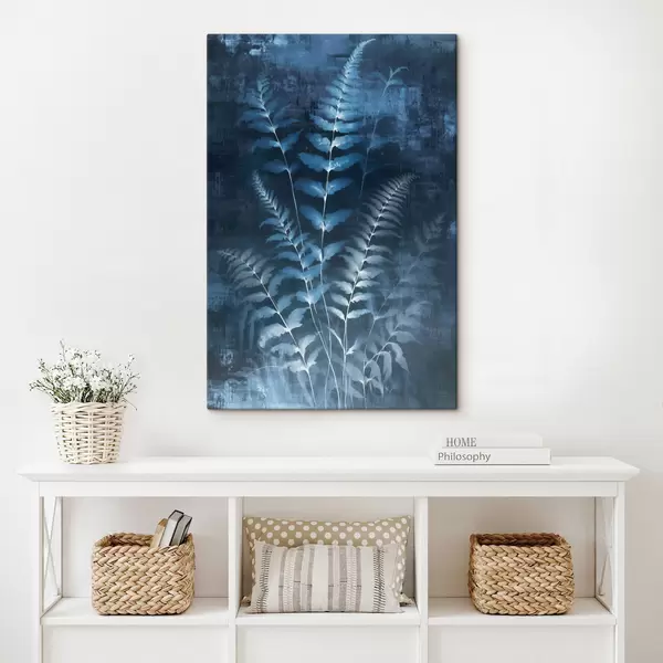 Pictură pe pânză Ferigi și plante albastre pe un fundal întunecat, texturat, cu accent pe detaliile complexe, efect de raze X Nr s47027
