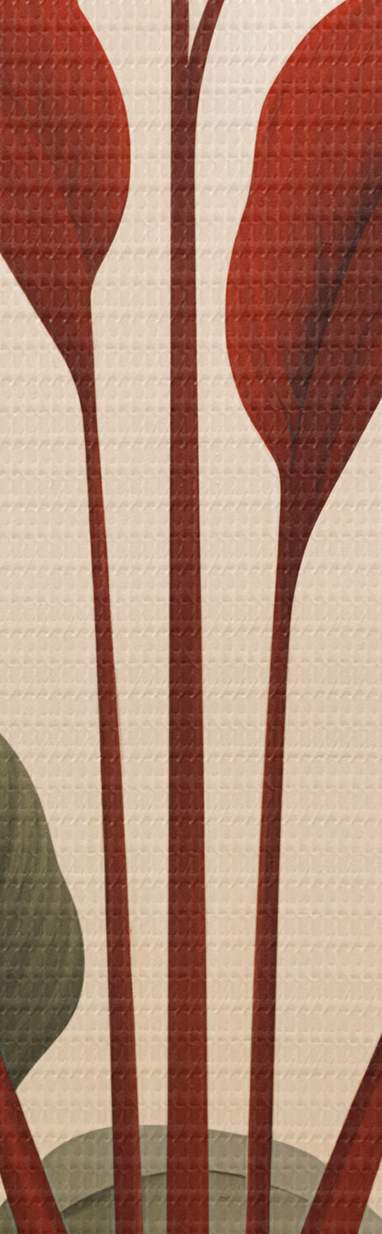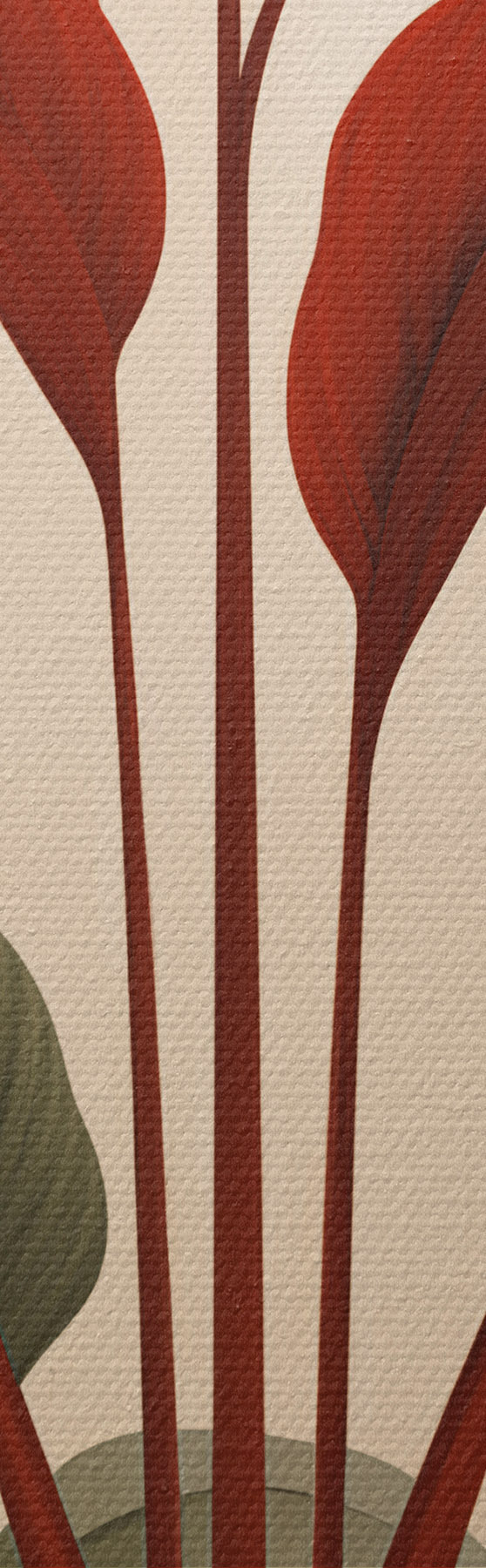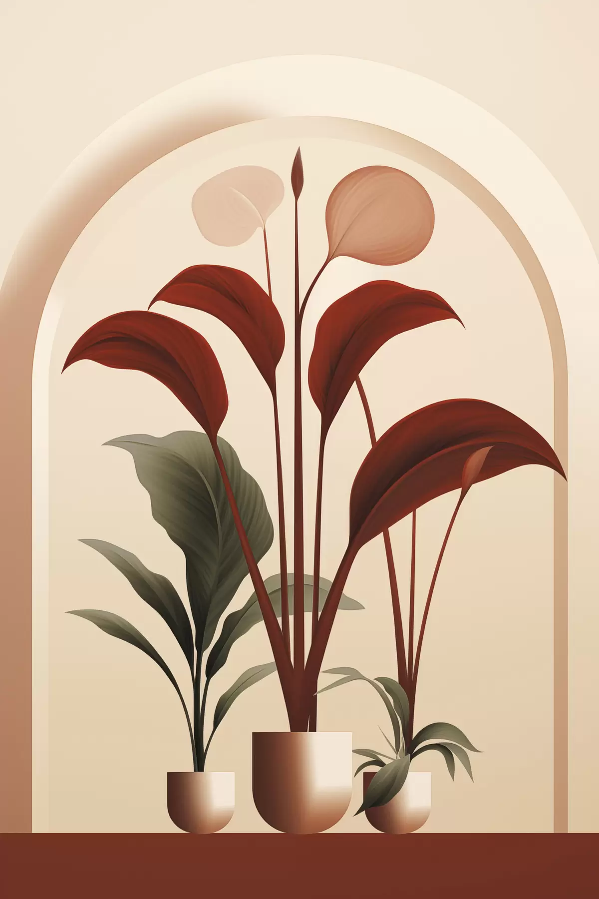 Tablouri Plante abstracte în ghivece, cu frunze mari verzi și roșii, în fața unei arcade de culoare crem. s47033