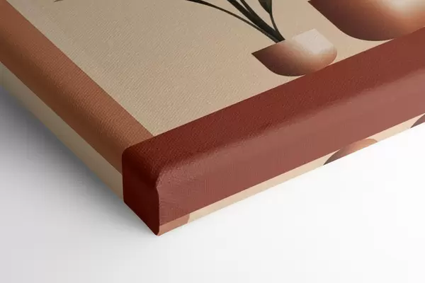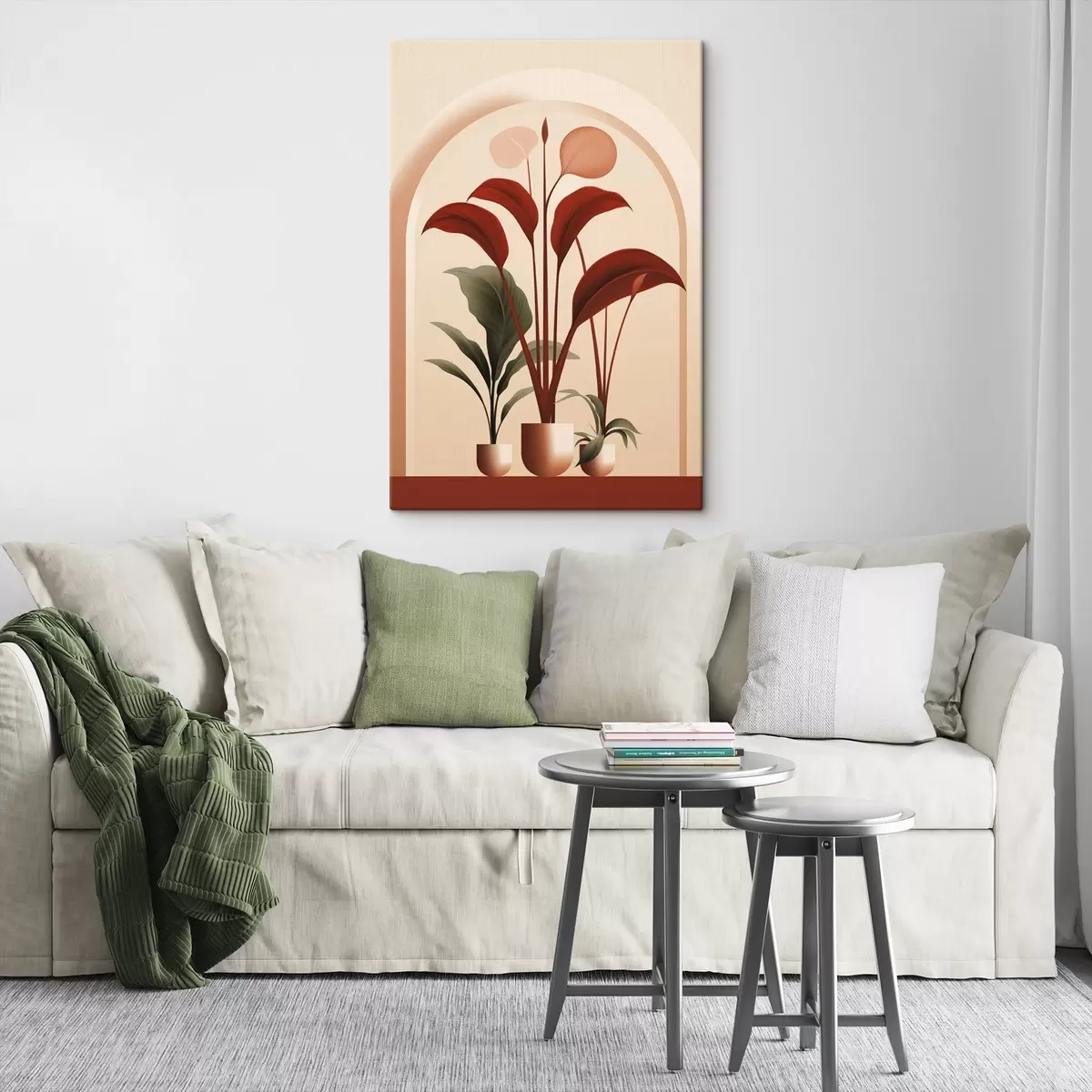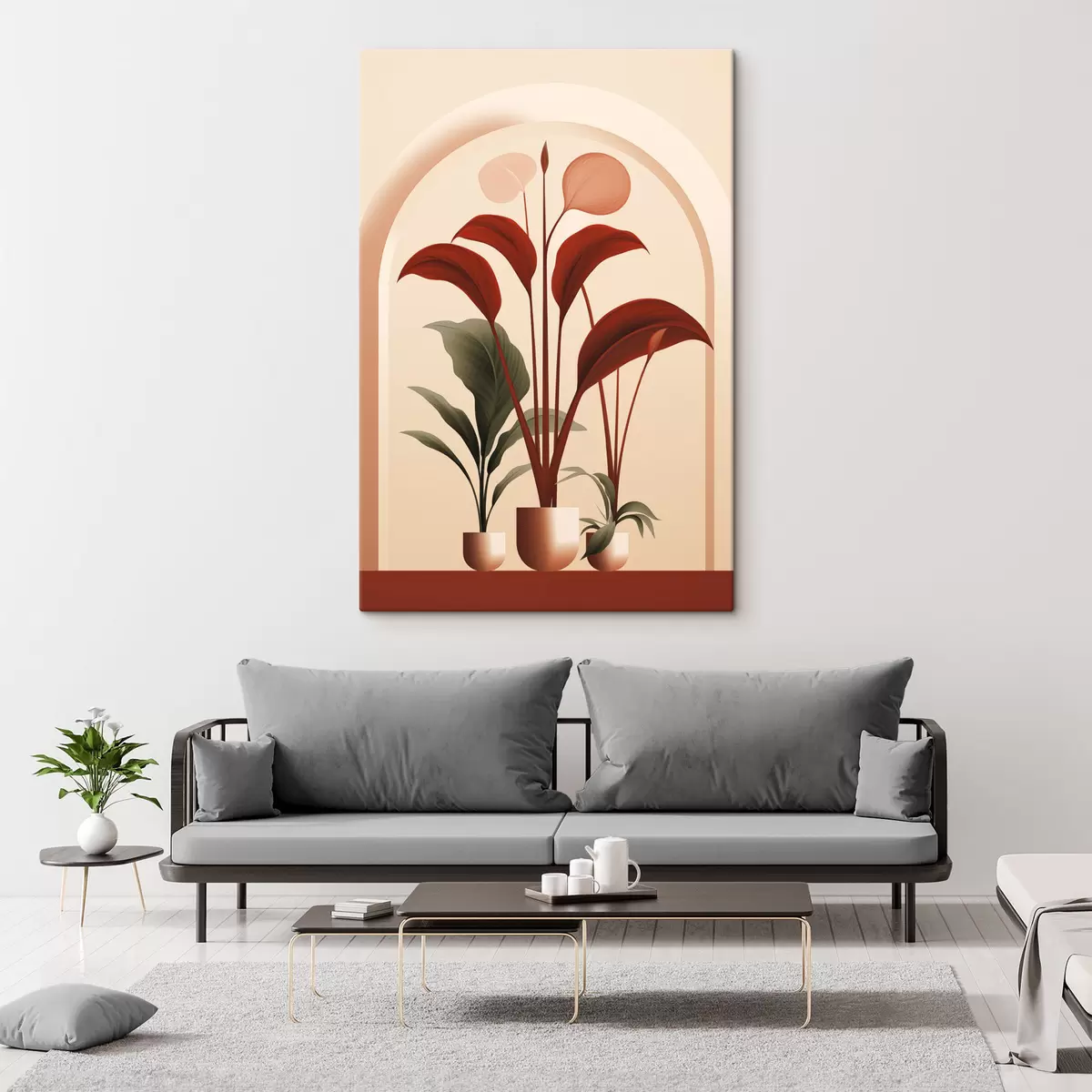 Pictură pe pânză Plante abstracte în ghivece, cu frunze mari verzi și roșii, în fața unei arcade de culoare crem. Nr s47033