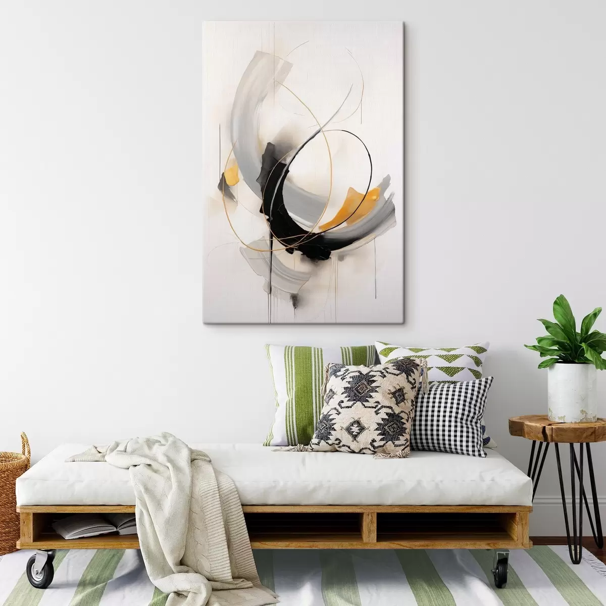 Tablouri Pictură abstractă cu imitații de pensule galbene, negre și albe, linii dinamice s47035