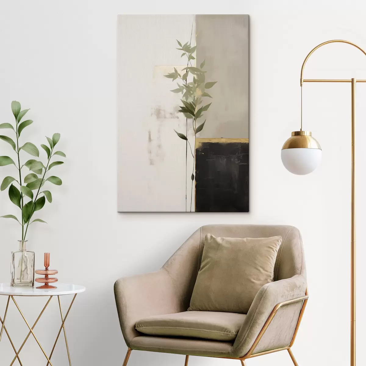 Pictură pe pânză O pictură minimalistă texturată reprezentând un vas cu frunze verzi pe un fundal de forme geometrice abstracte. Nr s47037