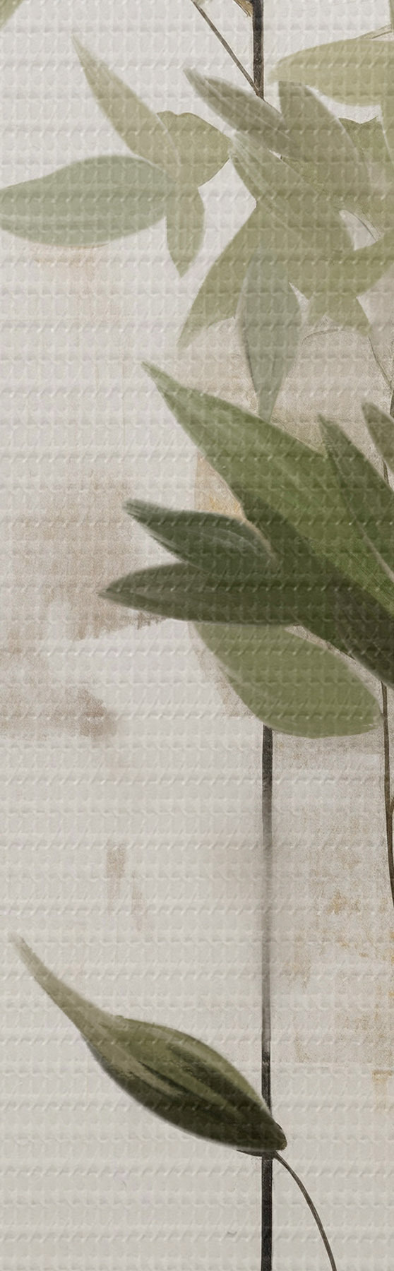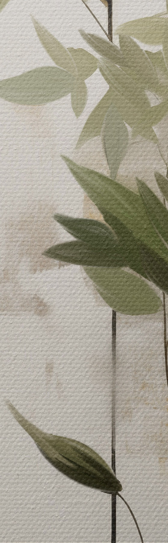 Tablouri O pictură minimalistă texturată reprezentând un vas cu frunze verzi pe un fundal de forme geometrice abstracte. s47037