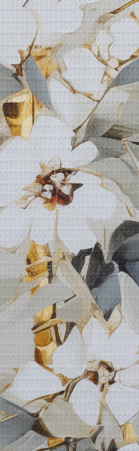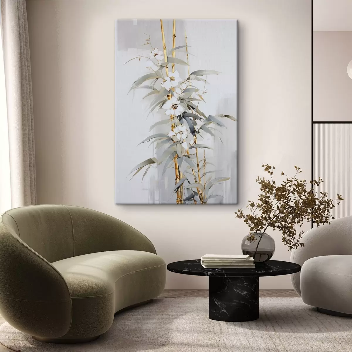 Pictură pe pânză Tulpini abstracte de bambus cu accente galbene, flori albe delicate și frunze verde pal, fundal gri Nr s47039