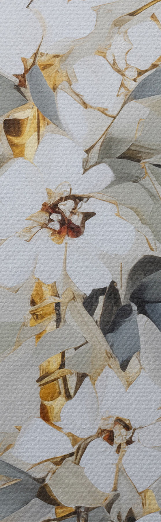 Tablouri Tulpini abstracte de bambus cu accente galbene, flori albe delicate și frunze verde pal, fundal gri s47039