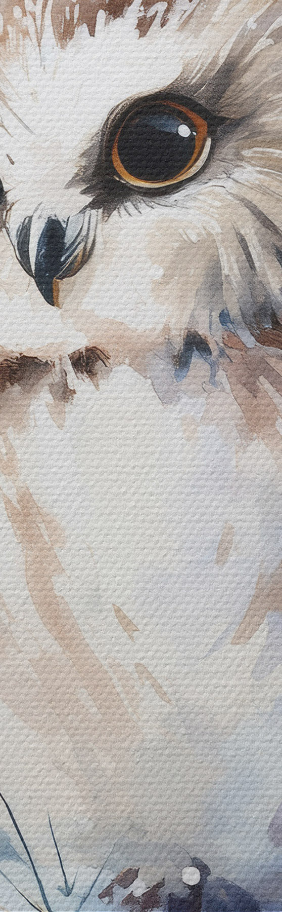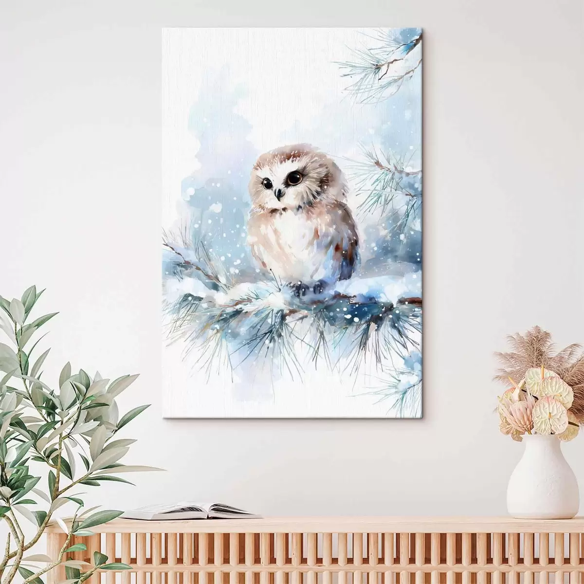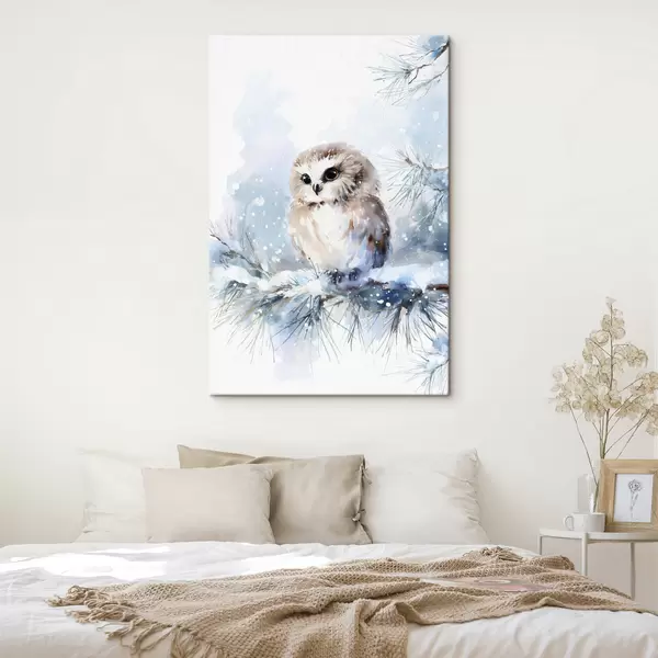 Pictură pe pânză bufniță drăguță pe o ramură de pin acoperită de zăpadă, în stil acuarelă Nr s47115