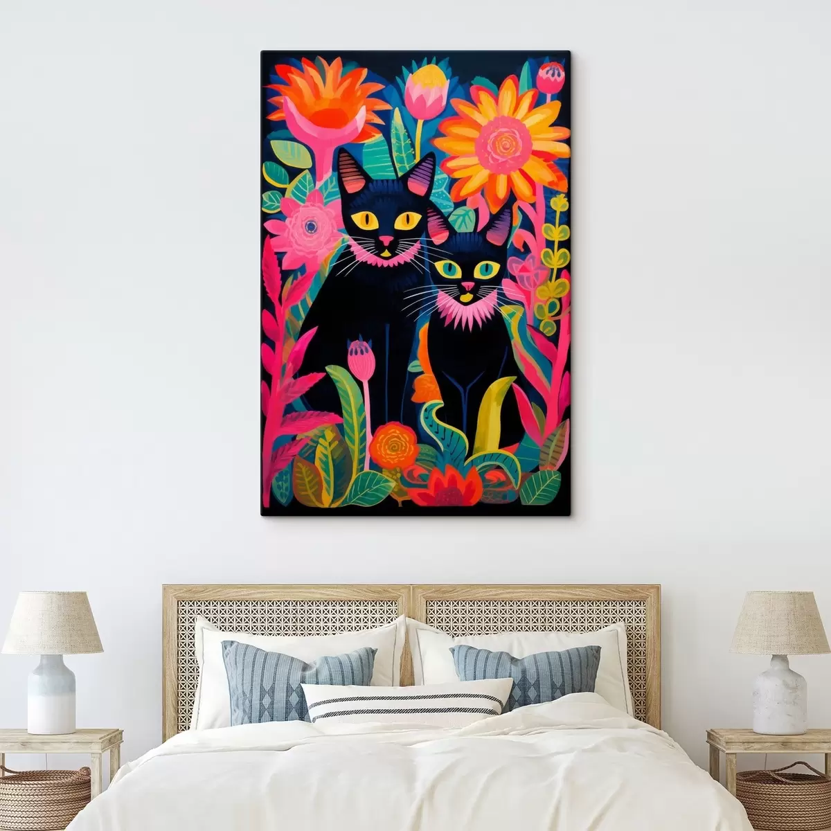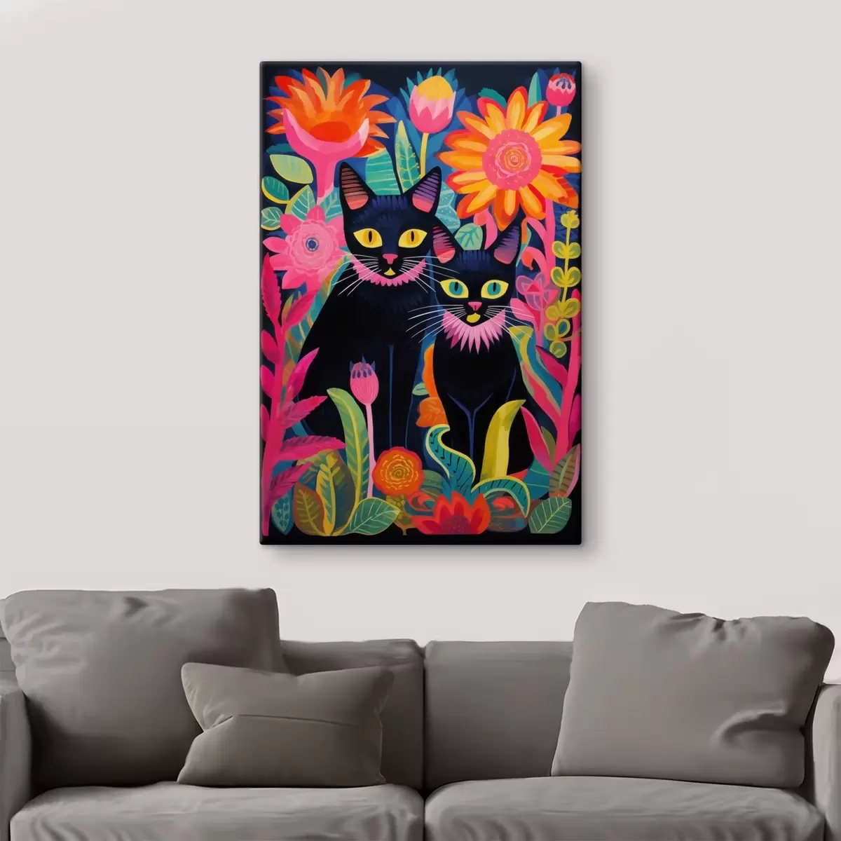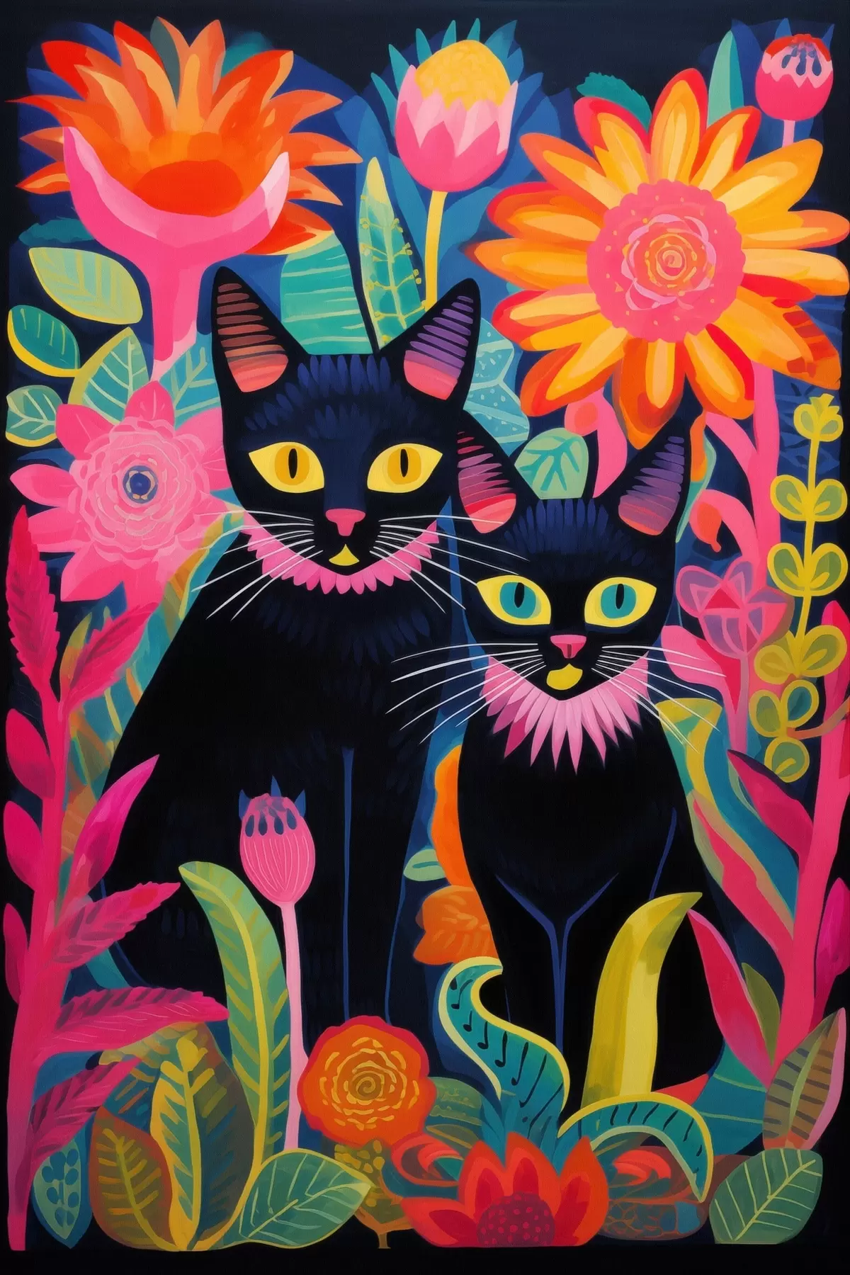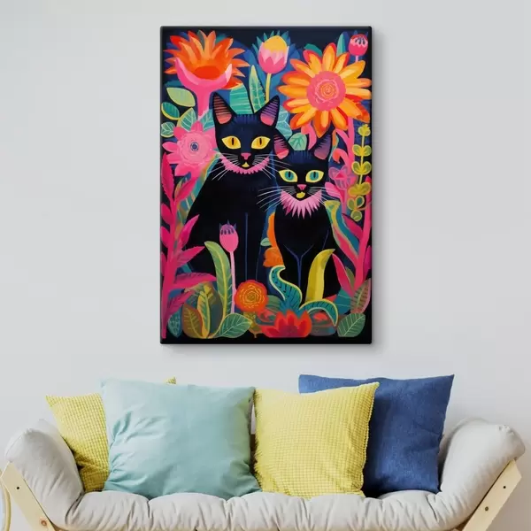 Pictură pe pânză Două pisici negre printre flori strălucitoare Nr s47299