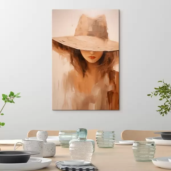 Pictură pe pânză Femeie cu pălărie, pictată cu tușe abstracte calde Nr s47312