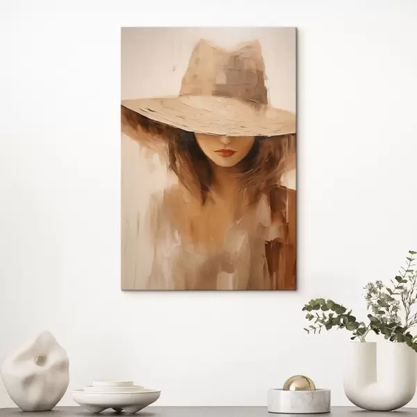 Pictură pe pânză Femeie cu pălărie, pictată cu tușe abstracte calde Nr s47312