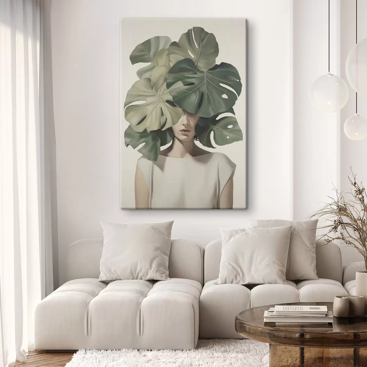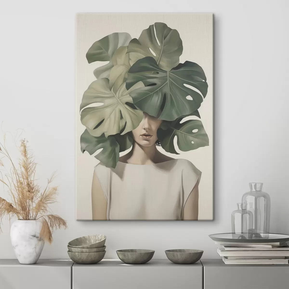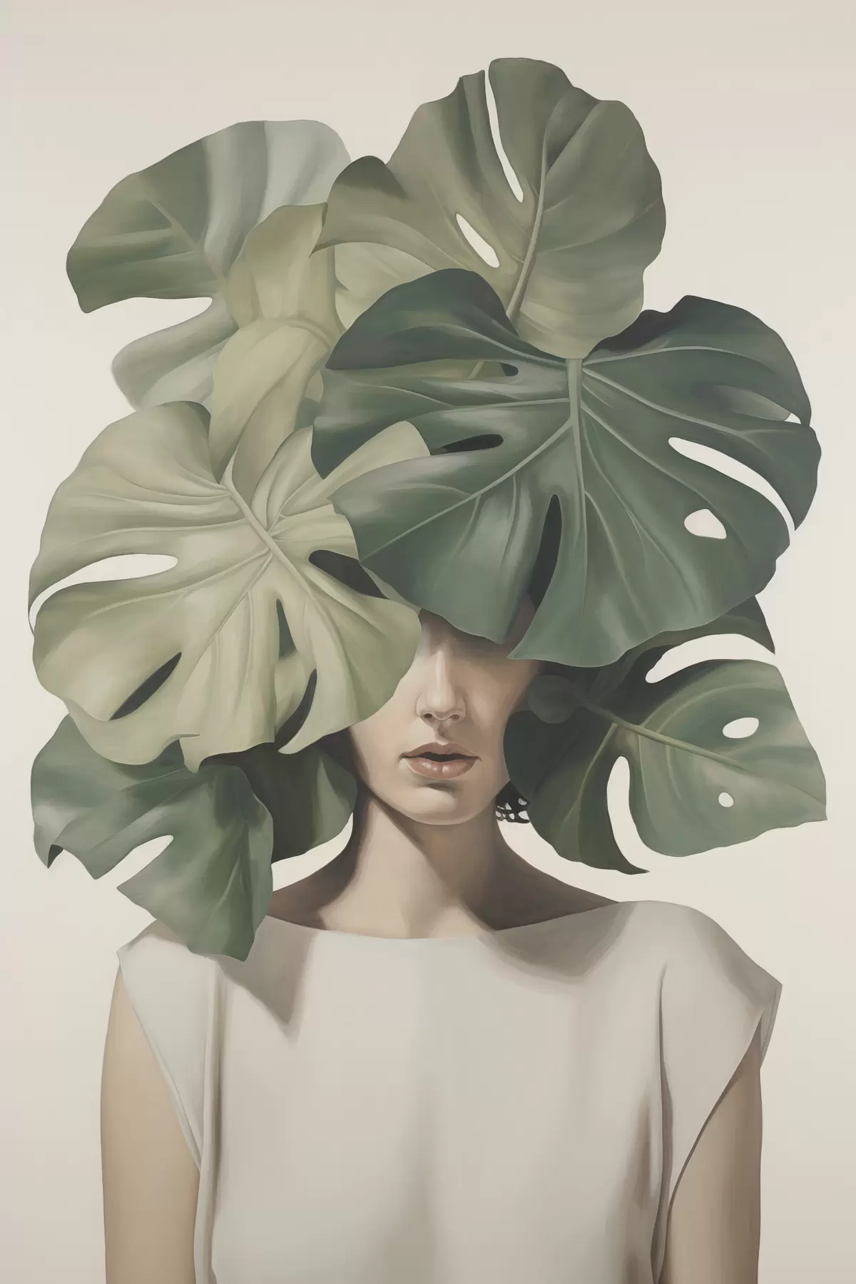 Tablouri Portret abstract al unei fete cu frunze de monstera s47336
