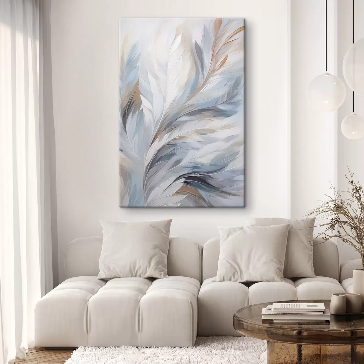 Pictură pe pânză Pene delicate de culoare albastru deschis și maro, cu o textură moale și eterică, pe un fundal alb. Nr s47416