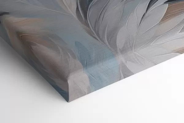 Pictură pe pânză Pene delicate de culoare albastru deschis și maro, cu o textură moale și eterică, pe un fundal alb. Nr s47416
