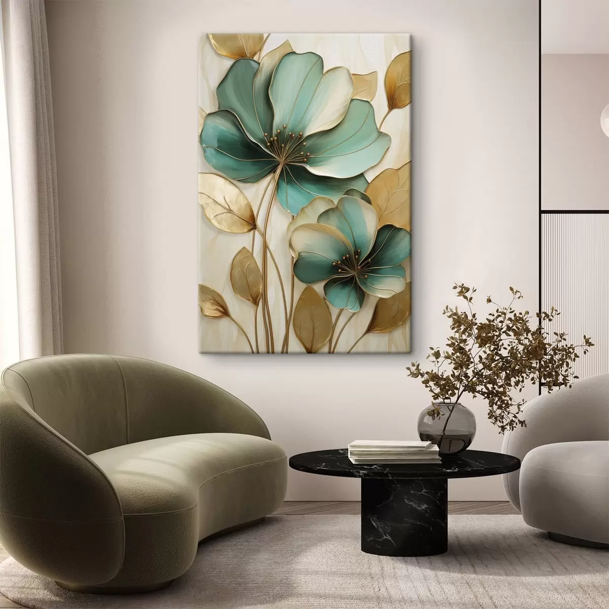 Tablouri Flori mari de culoare verde-albăstrui și galben, cu contururi, înconjurate de frunze galbene pe un fundal abstract s47418