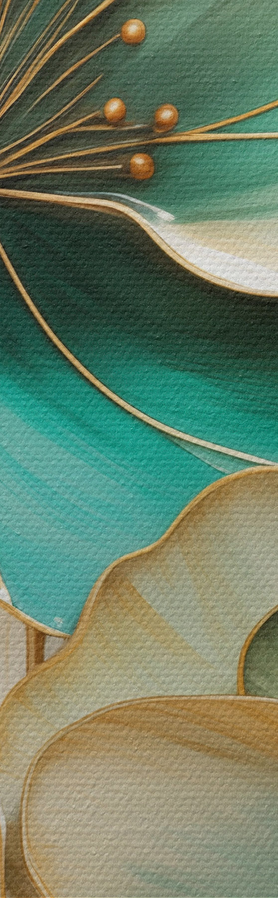 Pictură pe pânză Flori mari de culoare verde-albăstrui și galben, cu contururi, înconjurate de frunze galbene pe un fundal abstract Nr s47418