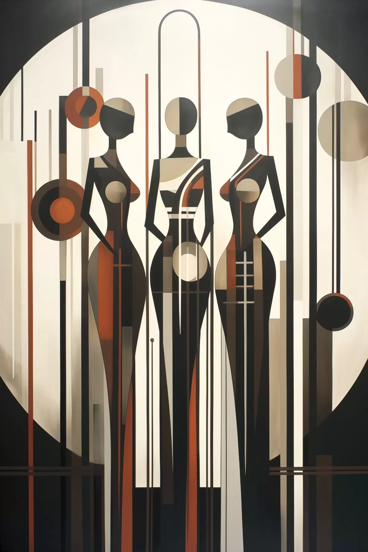 Tablouri Figuri feminine stilizate cu elemente geometrice pe un fundal abstract format din linii verticale și cercuri s47422