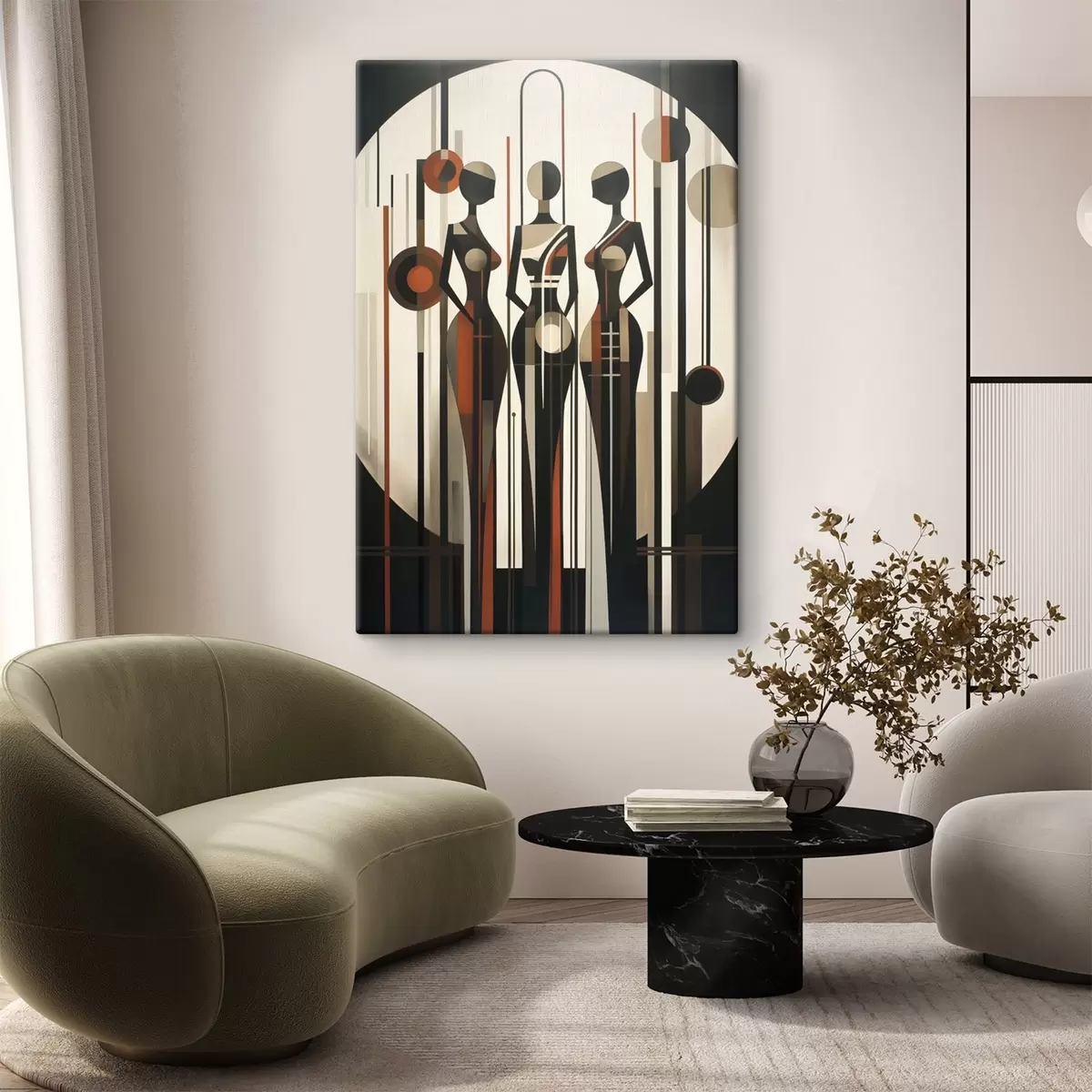 Pictură pe pânză Figuri feminine stilizate cu elemente geometrice pe un fundal abstract format din linii verticale și cercuri Nr s47422