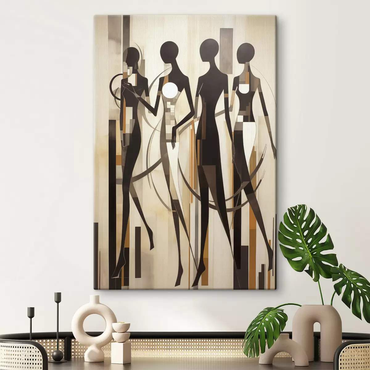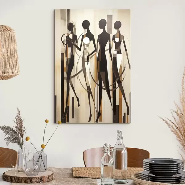 Pictură pe pânză Figuri feminine stilizate cu elemente geometrice pe un fundal abstract de linii verticale Nr s47423