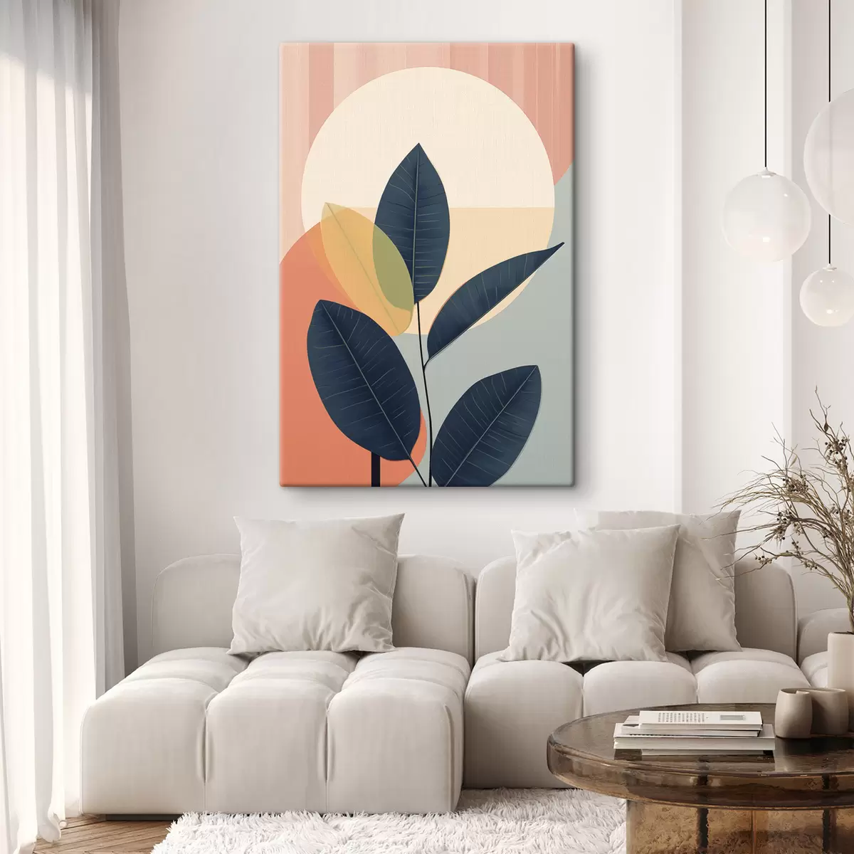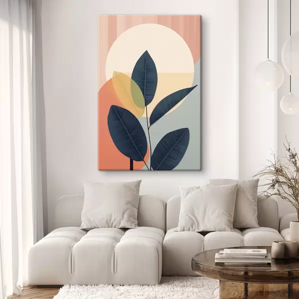Pictură pe pânză Frunze întunecate pe un fundal de forme abstracte în nuanțe de piersic și gri, cu un cerc mare, de culoare galben pal Nr s47424