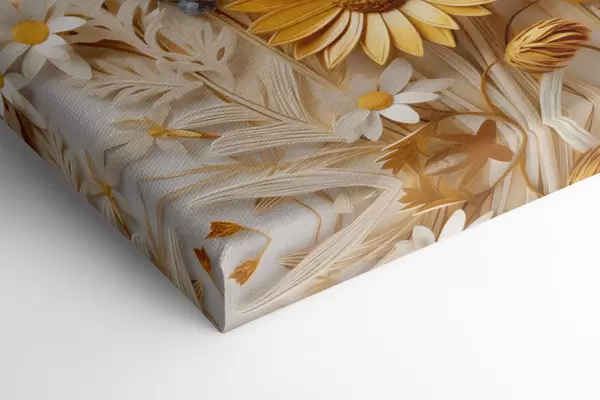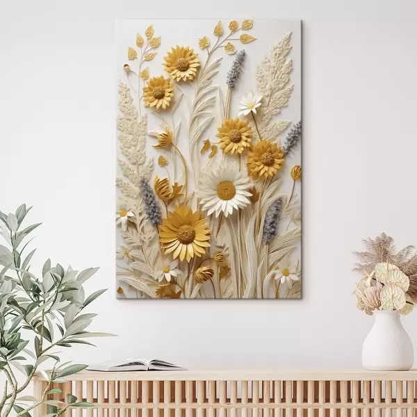 Pictură pe pânză O colecție texturată de margarete galbene și albe cu ierburi uscate și crenguțe de lavandă pe un fundal alb Nr s47430