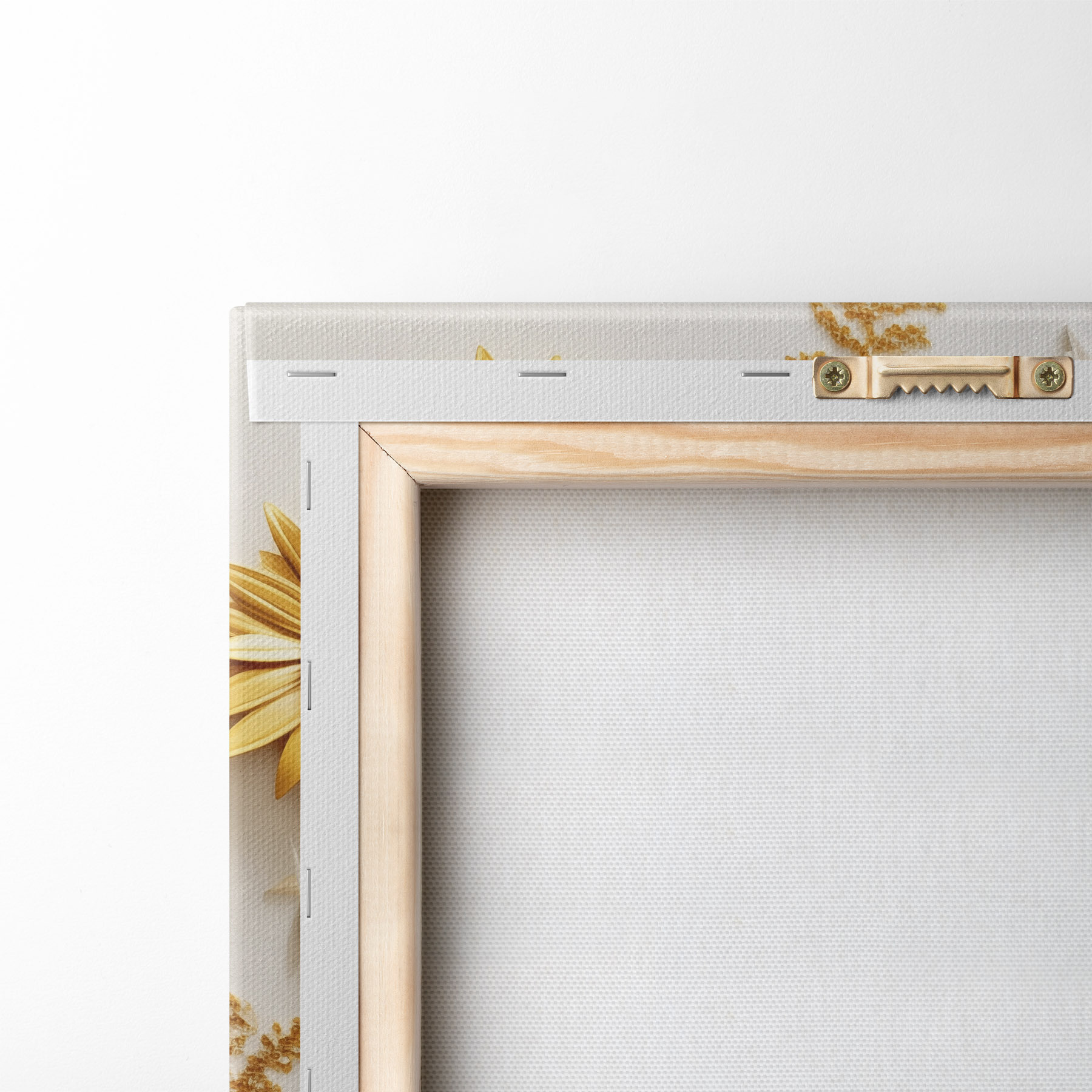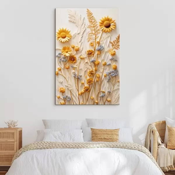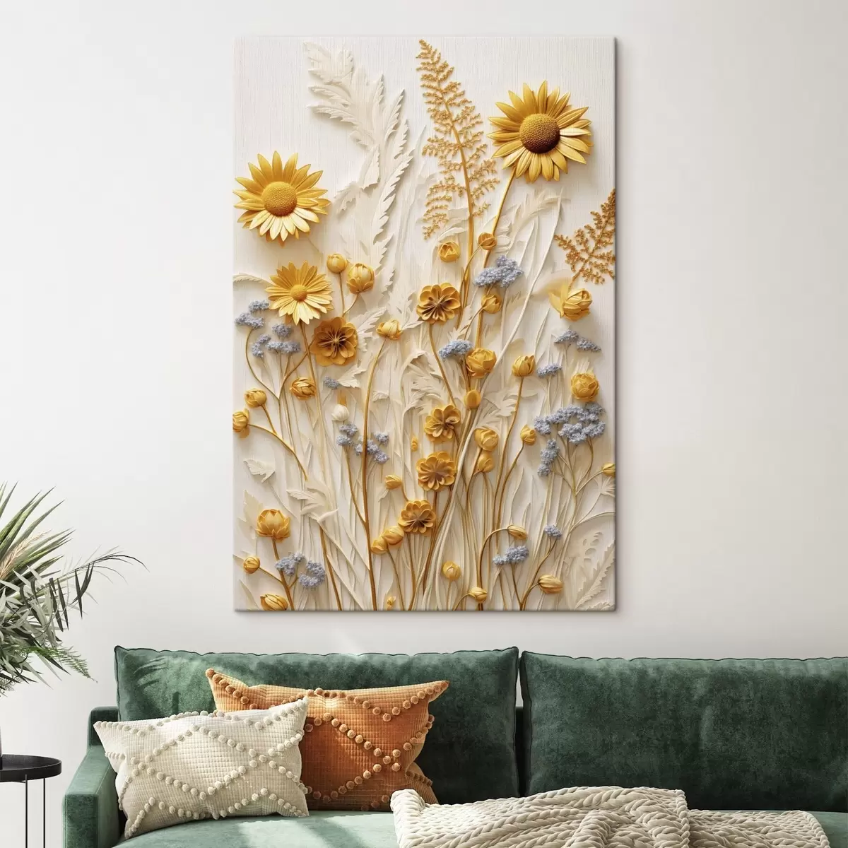 Pictură pe pânză O colecție texturată de margarete galbene și albe cu ierburi uscate și crenguțe de lavandă pe un fundal alb Nr s47431