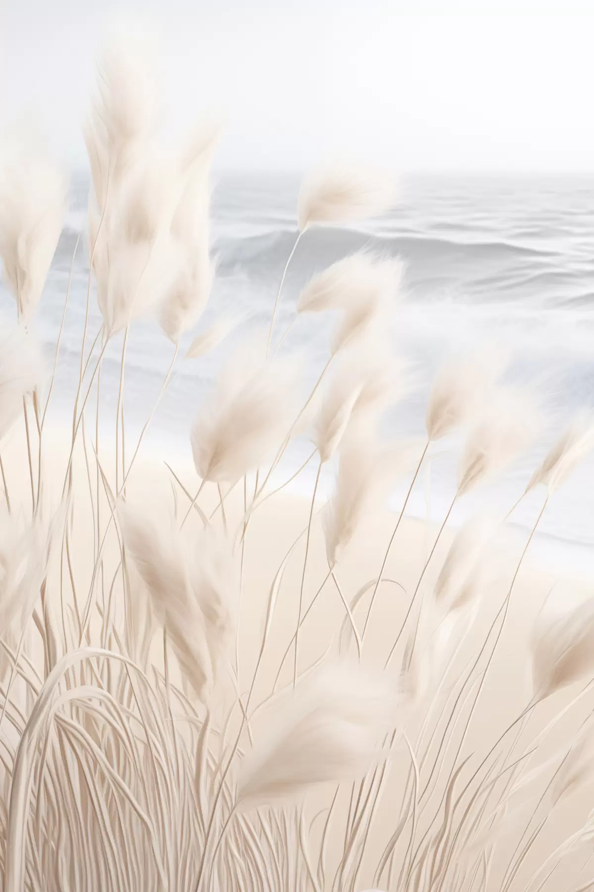 Tablouri Iarbă pampas înaltă și pufoasă, în nuanțe delicate de bej, în prim-plan, cu o plajă nisipoasă în fundal. s47432