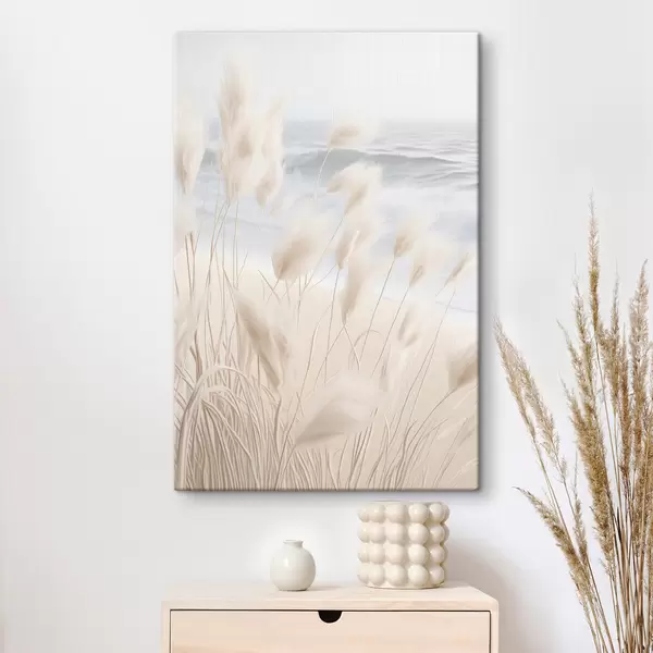Pictură pe pânză Iarbă pampas înaltă și pufoasă, în nuanțe delicate de bej, în prim-plan, cu o plajă nisipoasă în fundal. Nr s47432