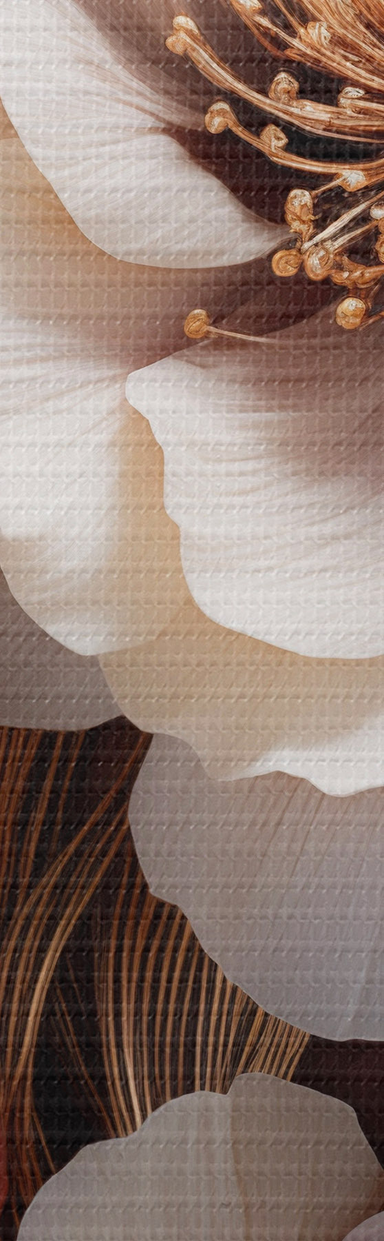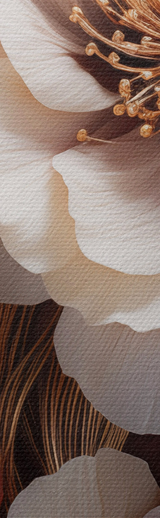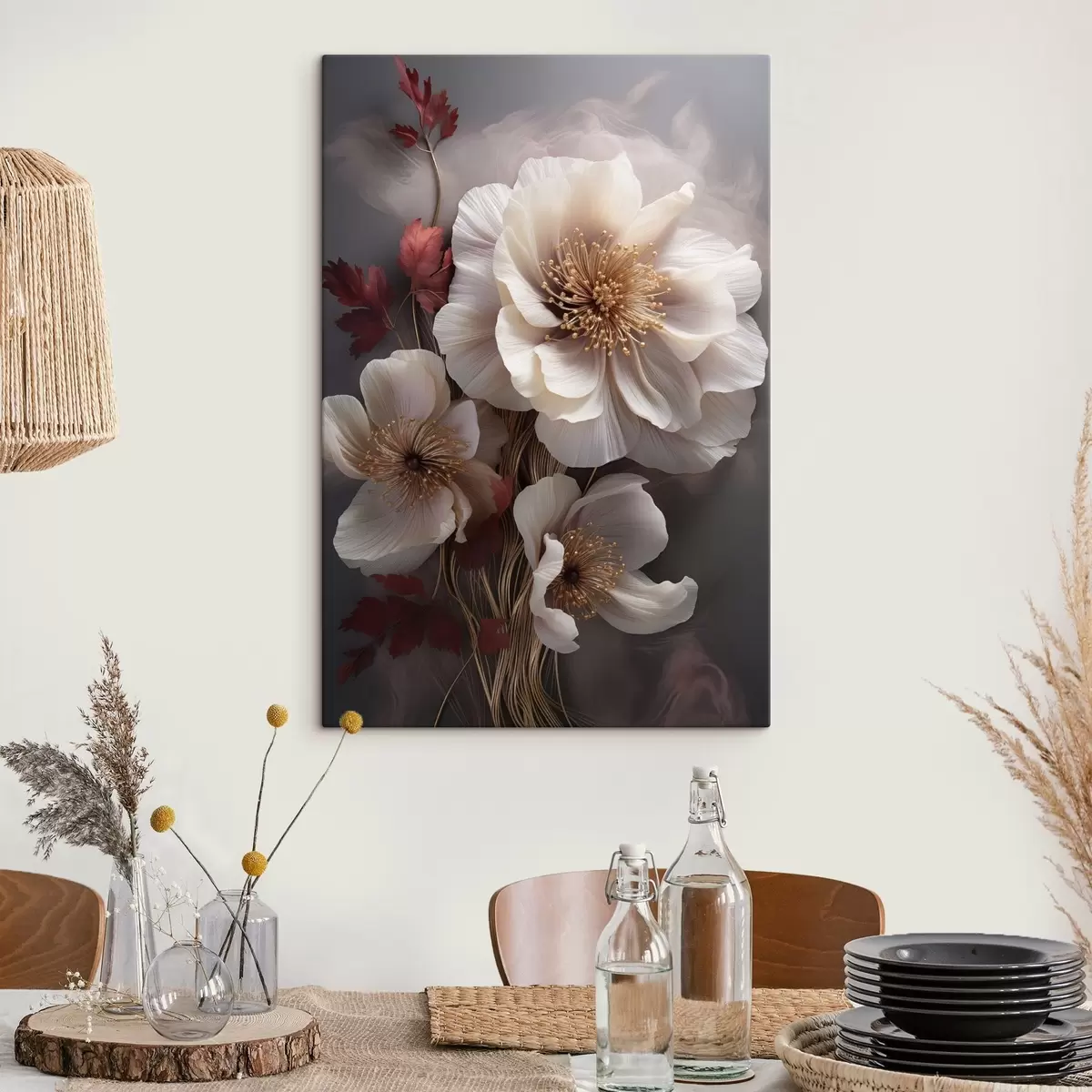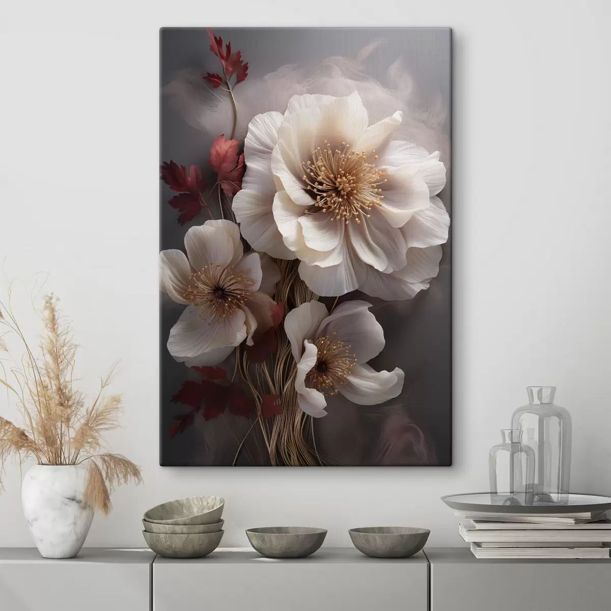 Pictură pe pânză Bujori delicați, cu petale subțiri și vaporoase, înconjurați de frunze roșii închise, pe un fundal abstract Nr s47434