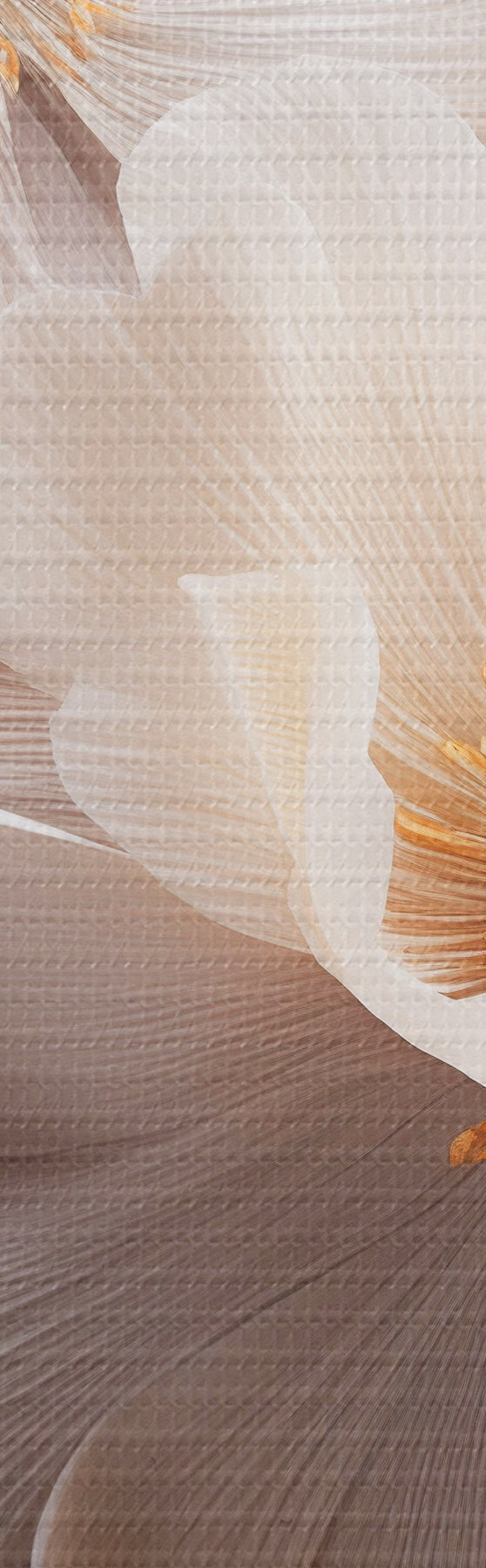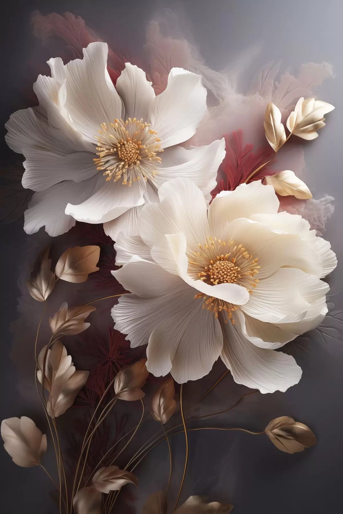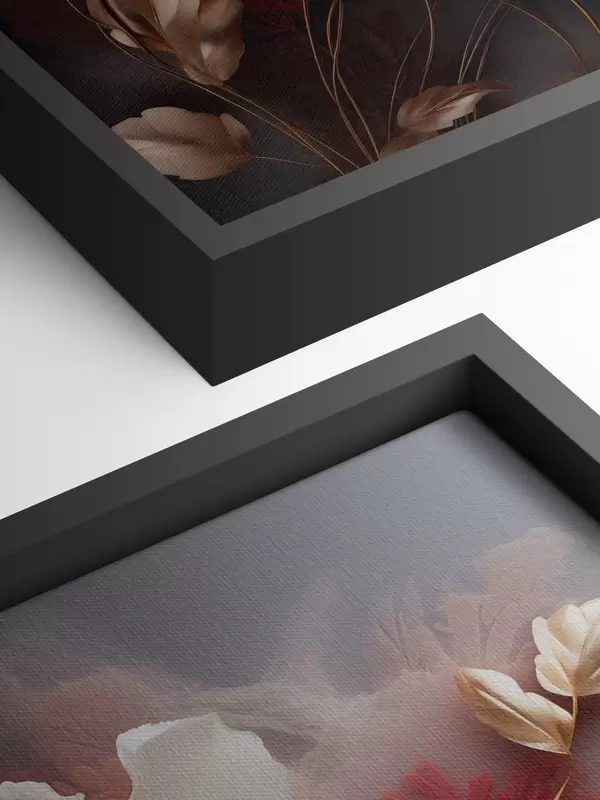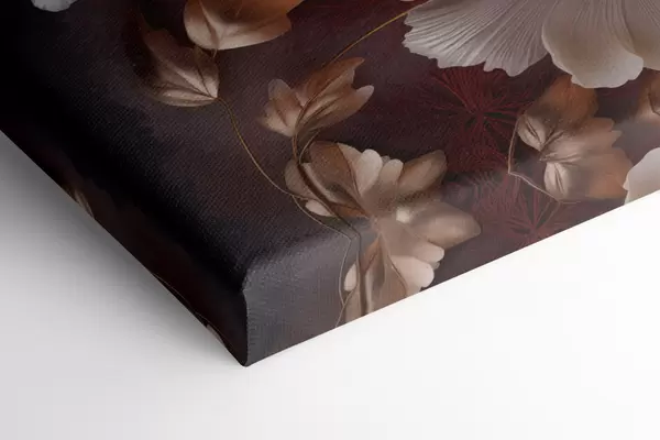 Tablouri Bujori delicați, cu petale subțiri și vaporoase, înconjurați de frunze roșii închise și galbene, pe un fundal abstract. s47435