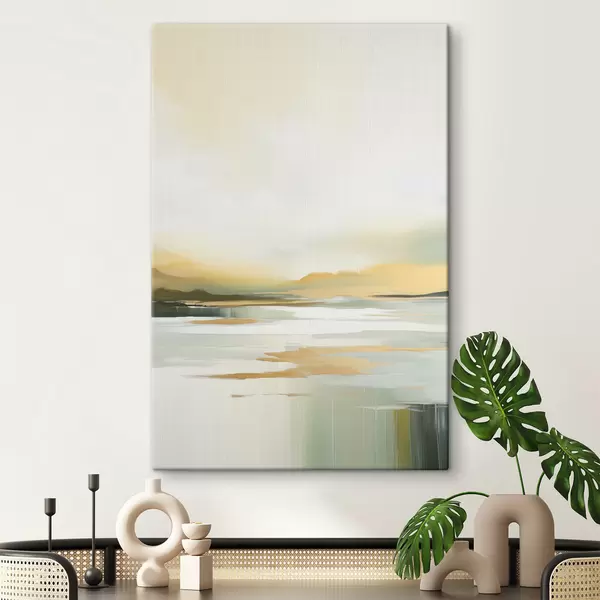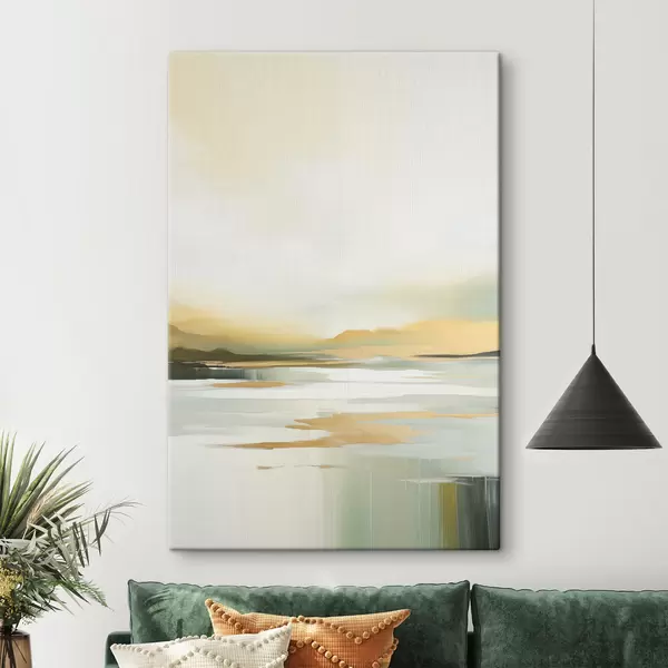 Pictură pe pânză Peisaj abstract în tonuri de galben și verde, apă care reflectă cerul și munții îndepărtați, cer palid și încețoșat Nr s47439