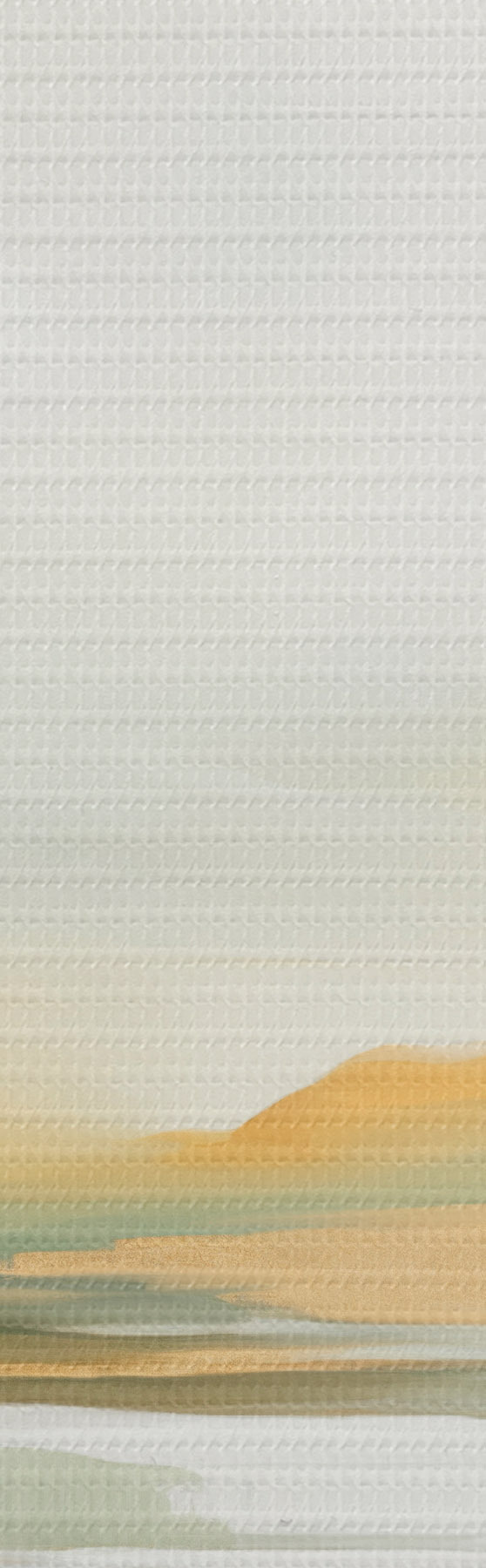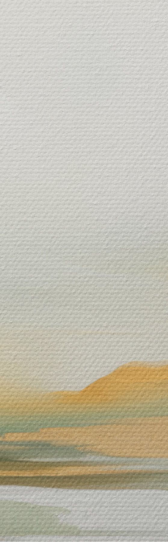 Tablouri Peisaj abstract în tonuri de galben și verde, apă care reflectă cerul și munții îndepărtați, cer palid și încețoșat s47439