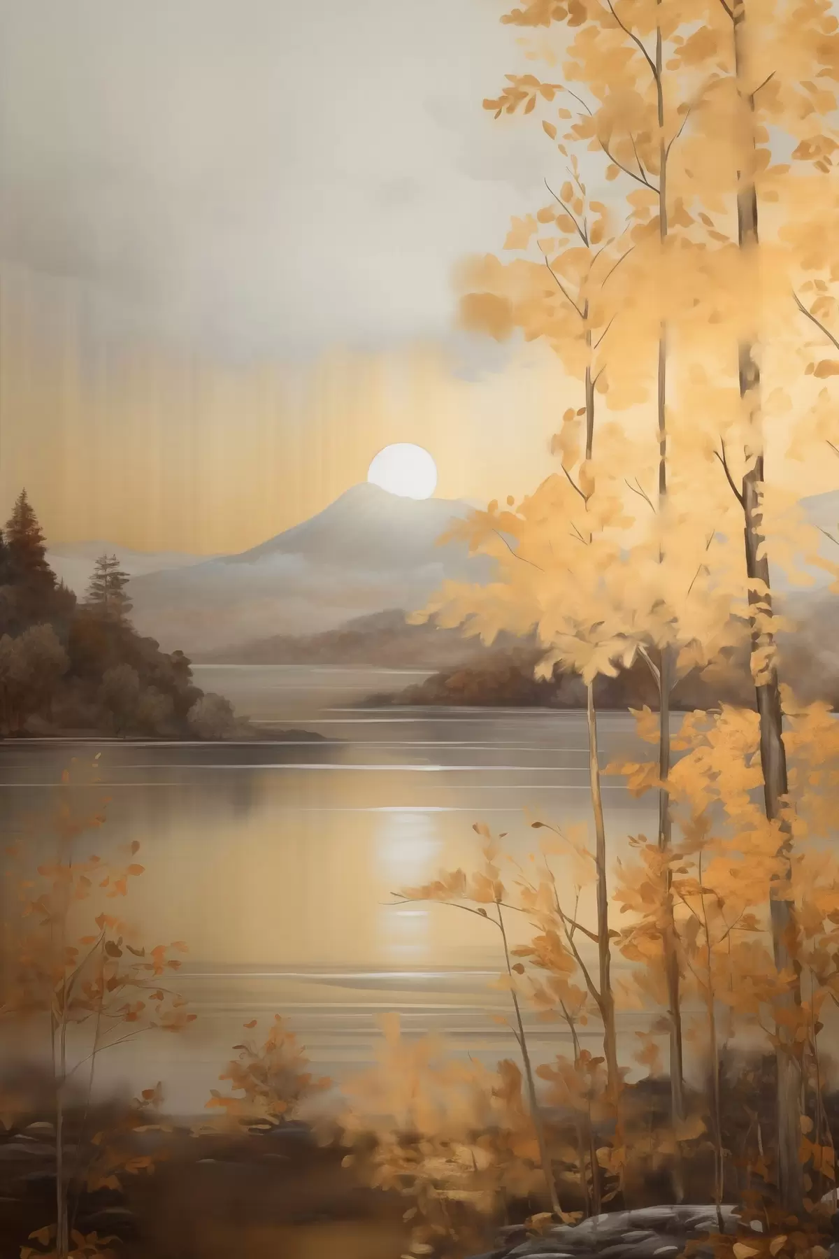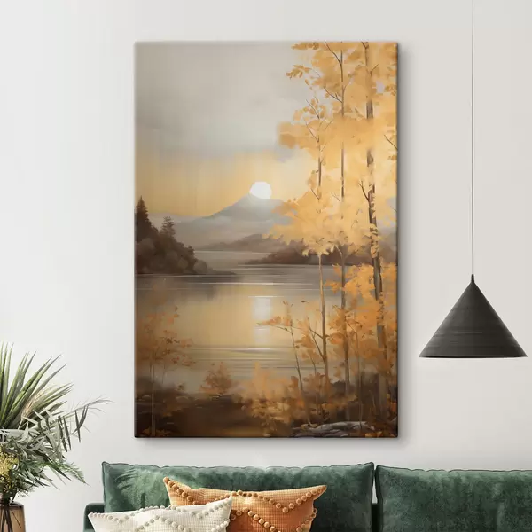 Pictură pe pânză Copacii cu frunze portocalii, specifici toamnei, încadrează un lac liniștit, cu munți îndepărtați, sub un cer înnorat. Nr s47440