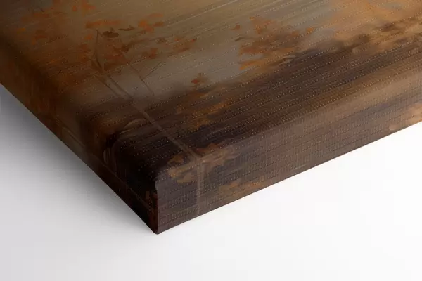 Pictură pe pânză Copacii cu frunze portocalii, specifici toamnei, încadrează un lac liniștit, cu munți îndepărtați, sub un cer înnorat. Nr s47440